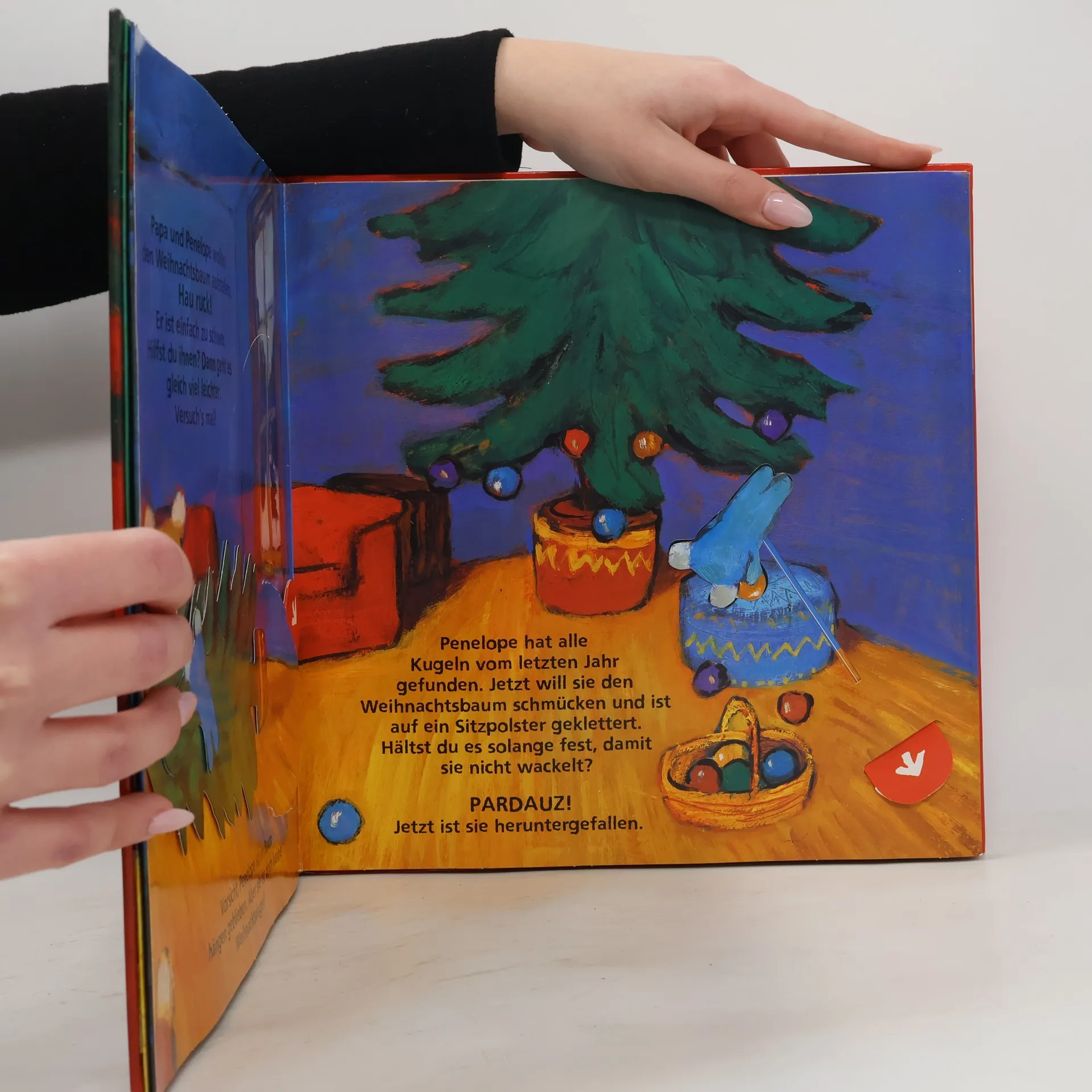 Morgen ist Weihnachten! Für Penelope gibt es nichts Schöneres, als das Haus und den Weihnachtsbaum zu schmücken - außer vielleicht, Geschenke auszupacken! Aber allein ist das nicht immer einfach. Hilfst du ihr dabei? Mit den Ziehklappen ist das ganz leicht.