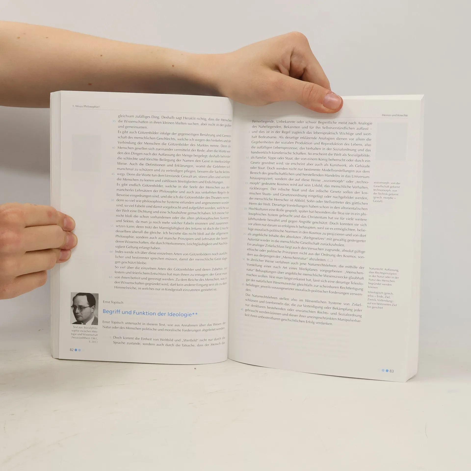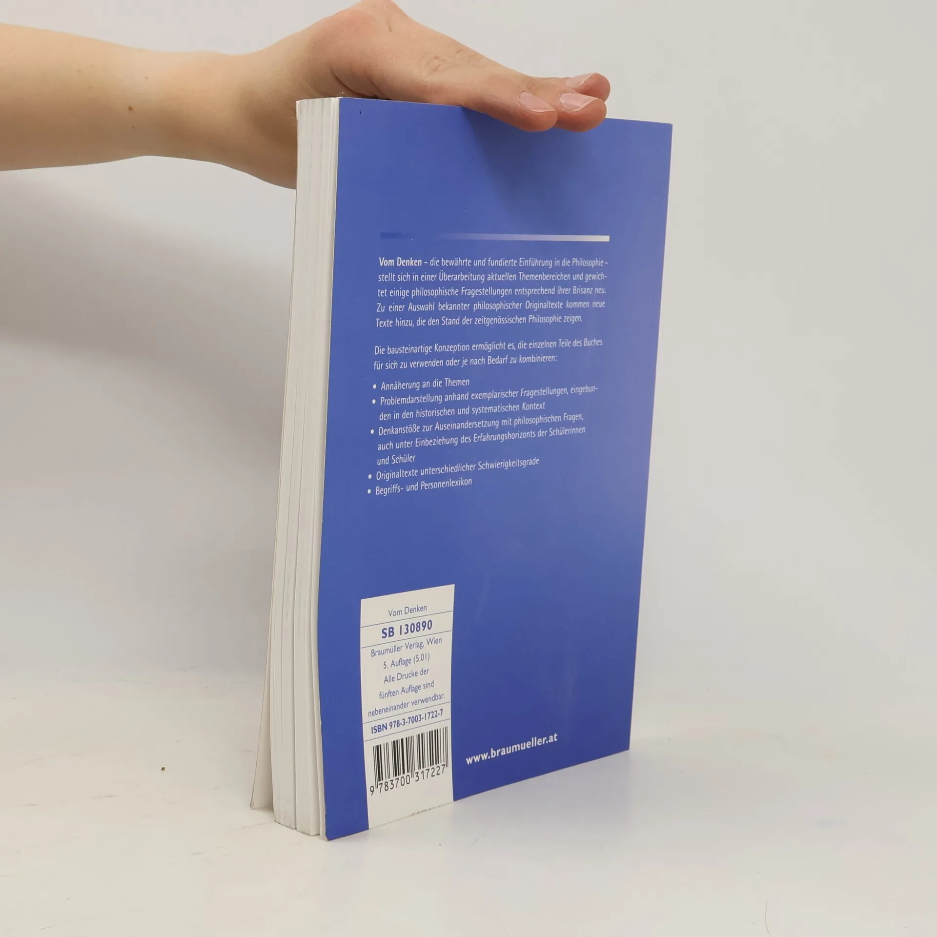 Die Philosophie-Einführung von Konrad Paul Liessmann und Gerhard Zenaty ist seit Jahren Standard und Referenz - in der Bearbeitung durch die junge Autorin Katharina Lacina besonders schülergerecht. Zum Konzept Baustein-Konzept: Annäherung, Problemdarstellung anhand exemplarischer Fragestellungen, weiterführende Denkanstöße – einzeln oder in Kombination zu verwenden kommentierte Originaltexte, gekennzeichnet nach Schwierigkeitsgrad Anhang mit Glossar (Begriffs- und Philosophenlexikon, Sach- und Personenregister) Fremdworterklärungen, Querverweise und inhaltliche Orientierungshilfen in der Randspalte Umfangreiches Lehrerbegleitheft als Gratis-Download (Lernziele, Kopiervorlagen - z.B. \"Philosophische Dialoge\", Arbeitsvorschläge, Literatur- und Webtipps u.v.m.) und Printversion (gegen Schutzgebühr) Aus dem Inhalt Wozu Philosophie? Philosophische Fragestellungen kennenlernen und beschreiben – Das Wahre und das Falsche: Die Problematik von Wirklichkeit und ihre Erkenntnis nachvollziehen und analysieren – Das Wesen des Menschen: Sinn und Ziel menschlicher Existenz – Das Gute und das Böse: Ethische Fragestellungen und Positionen