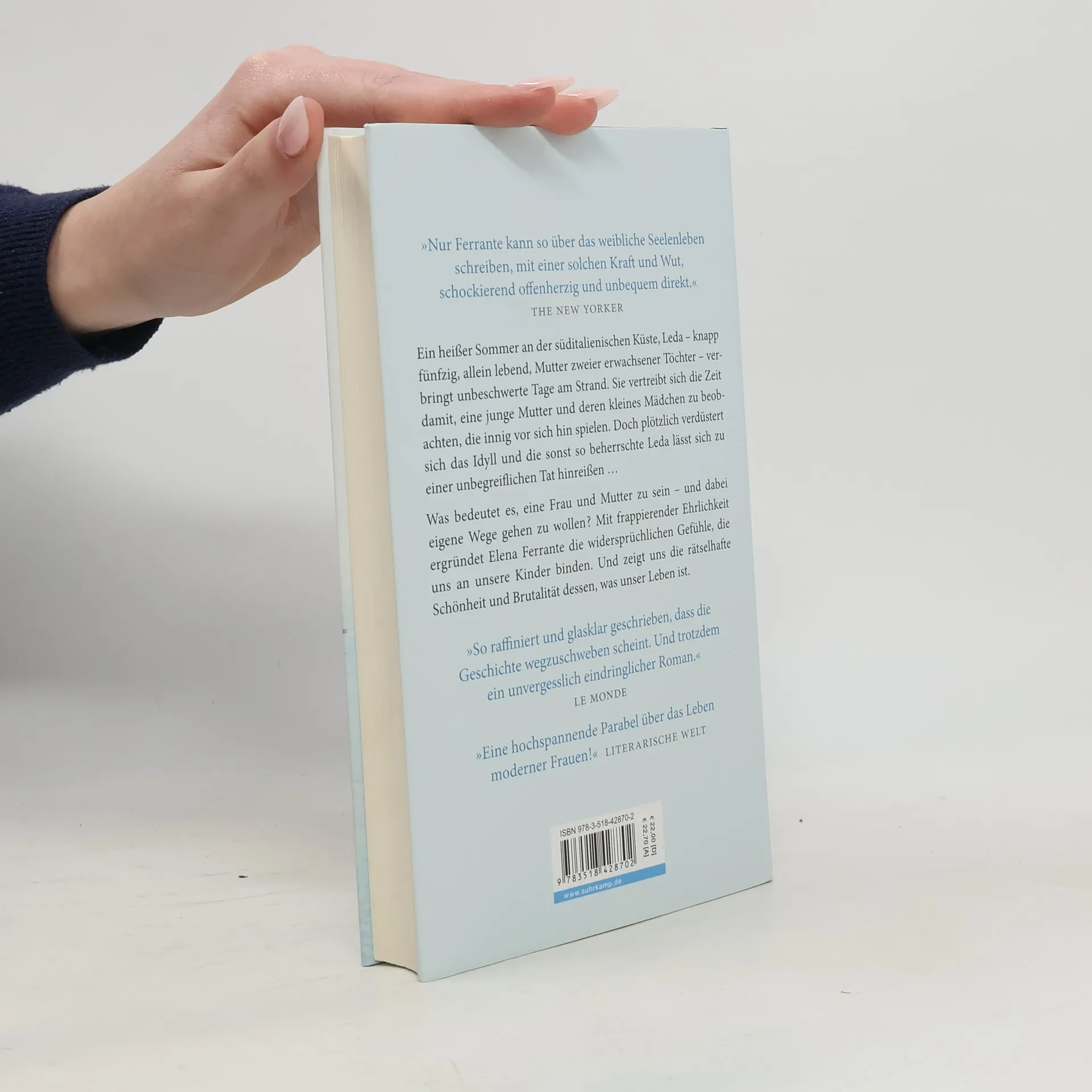 Leda ist fast fünfzig, geschieden, sie unterrichtet Englisch an der Universität in Florenz. Die erwachsenen Töchter sind jetzt beim Vater in Kanada, und Leda muss sich eingestehen, dass sie statt der erwarteten Sehnsucht vor allem Erleichterung empfindet. Den heißen Sommer verbringt sie in einem süditalienischen Küstenort: Bücher, Sonne, das Meer, was könnte friedlicher sein? Am Strand macht sich neben ihr allerdings eine übermütig lärmende neapolitanische Großfamilie breit, darunter eine noch junge Mutter und deren kleine Tochter. Leda beobachtet die beiden über Tage, zunächst fasziniert, wohlwollend. Allmählich aber schlägt ihre Stimmung um, irgendwann folgt sie einem Impuls und tut dem kleinen Mädchen und der Familie etwas Unbegreifliches an. Und wird selber heimgesucht, von lange verdrängten Erinnerungen – an gravierende Entscheidungen, die sie zu treffen hatte, ganz zum Leidwesen ihrer eigenen Töchter ... Was bedeutet es, eine Frau und Mutter zu sein? Mit frappierender Ehrlichkeit ergründet Elena Ferrante die widersprüchlichen Gefühle, die uns an unsere Kinder binden.