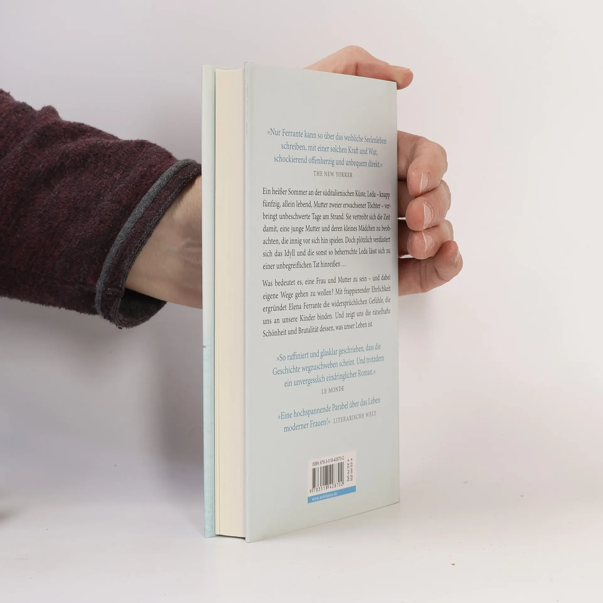 Leda ist fast fünfzig, geschieden, sie unterrichtet Englisch an der Universität in Florenz. Die erwachsenen Töchter sind jetzt beim Vater in Kanada, und Leda muss sich eingestehen, dass sie statt der erwarteten Sehnsucht vor allem Erleichterung empfindet. Den heißen Sommer verbringt sie in einem süditalienischen Küstenort: Bücher, Sonne, das Meer, was könnte friedlicher sein? Am Strand macht sich neben ihr allerdings eine übermütig lärmende neapolitanische Großfamilie breit, darunter eine noch junge Mutter und deren kleine Tochter. Leda beobachtet die beiden über Tage, zunächst fasziniert, wohlwollend. Allmählich aber schlägt ihre Stimmung um, irgendwann folgt sie einem Impuls und tut dem kleinen Mädchen und der Familie etwas Unbegreifliches an. Und wird selber heimgesucht, von lange verdrängten Erinnerungen – an gravierende Entscheidungen, die sie zu treffen hatte, ganz zum Leidwesen ihrer eigenen Töchter ... Was bedeutet es, eine Frau und Mutter zu sein? Mit frappierender Ehrlichkeit ergründet Elena Ferrante die widersprüchlichen Gefühle, die uns an unsere Kinder binden.