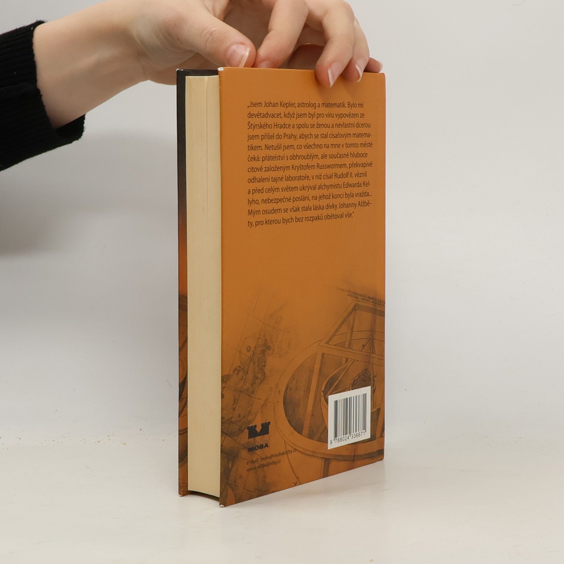 Pražská léta Jana Keplera "Jsem Jan Kepler, astrolog a matematik. Bylo mi devětadvacet, když jsem byl pro víru vypovězen ze Štýrského Hradce a spolu se ženou a nevlastní dcerou jsem přišel do Prahy, abych se stal císařovým matematikem. Netušil jsem, co všechno na mne v tomto městě čeká: přátelství s obhroublým, ale současně hluboce citově založeným Kryštofem Russwormem, překvapivé odhalení tajné laboratoře, v níž císař Rudolf II. věznil a před celým světem ukrýval alchymistu Edwarda Kellyho, nebezpečné poslání, na jehož konci byla vražda... Mým osudem se však stala láska dívky Johanny Alžběty, pro kterou bych bez rozpaků obětoval vše. Byla to láska, která rozhodla o tom, abych přijal výzvu k souboji se známým pražským duelantem..."