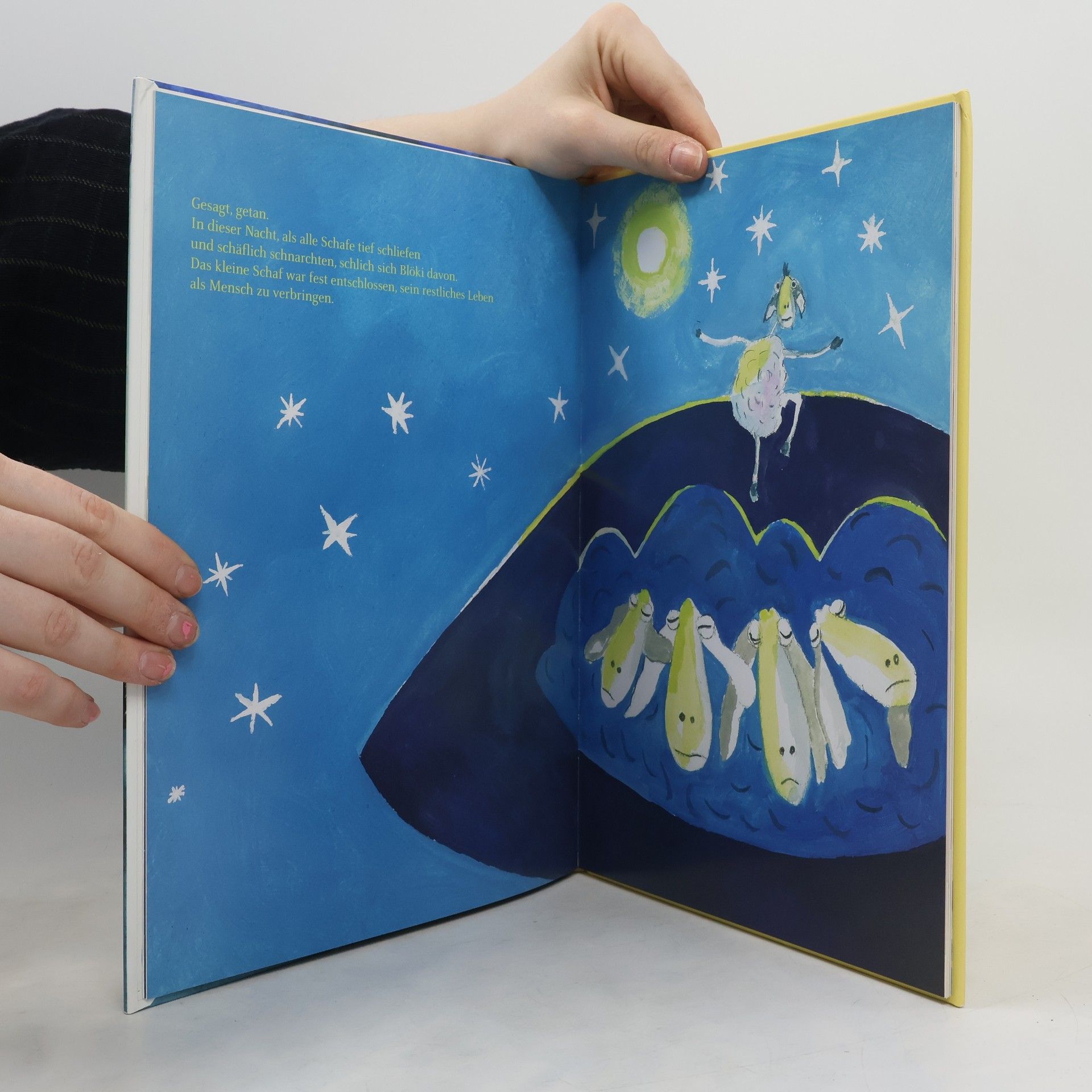 Blöki, das kleine Schaf, möchte gerne ein Mensch sein, weil es gehört hatte, Schafe seien dumm. Das bedrückt das kleine Schaf so sehr, dass es all die anstrengenden Dinge lernt, die Menschen tun: In Betten zu schlafen, ohne herauszupurzeln. Bei Tisch mit Messer und Gabel zu essen, sich Hemd und Hose anzuziehen und natürlich auf zwei Beinen zu gehen. Der Wachhund Wuff steht Blöki mit Rat und Tat zur Seite, hat er doch mannigfaltige Erfahrung im Umgang mit Menschen gesammelt. Um sich seinen großen Wunsch zu erfüllen, ein kleines, rotes Auto zu kaufen, muss das kleine Schaf aber auch hart arbeiten und Geld verdienen. So heuert Blöki in einer Fabrik an. Nachts im Traum wird ihm bewusst, was für ein beschwerliches und bedrückendes Leben als Mensch es jetzt vor sich hat. Es vermisst die satten Wiesen, das lustige Spielen mit seinen Freunden. Und plötzlich weiß es: „Ich will wieder zurück nach Hause! Denn ich glaube, - so blöd sind wir Schafe gar nicht!“ Ein phantasiepvolles Kinderbuch, das seine LeserInnen Grenzen überschreiten und zu ihren Träumen zurückfinden lässt. Zauberhafte Bilder illustrieren die phantastische Geschichte einer abenteuerlichen Reise. Für Kinder ab 5 Jahren!