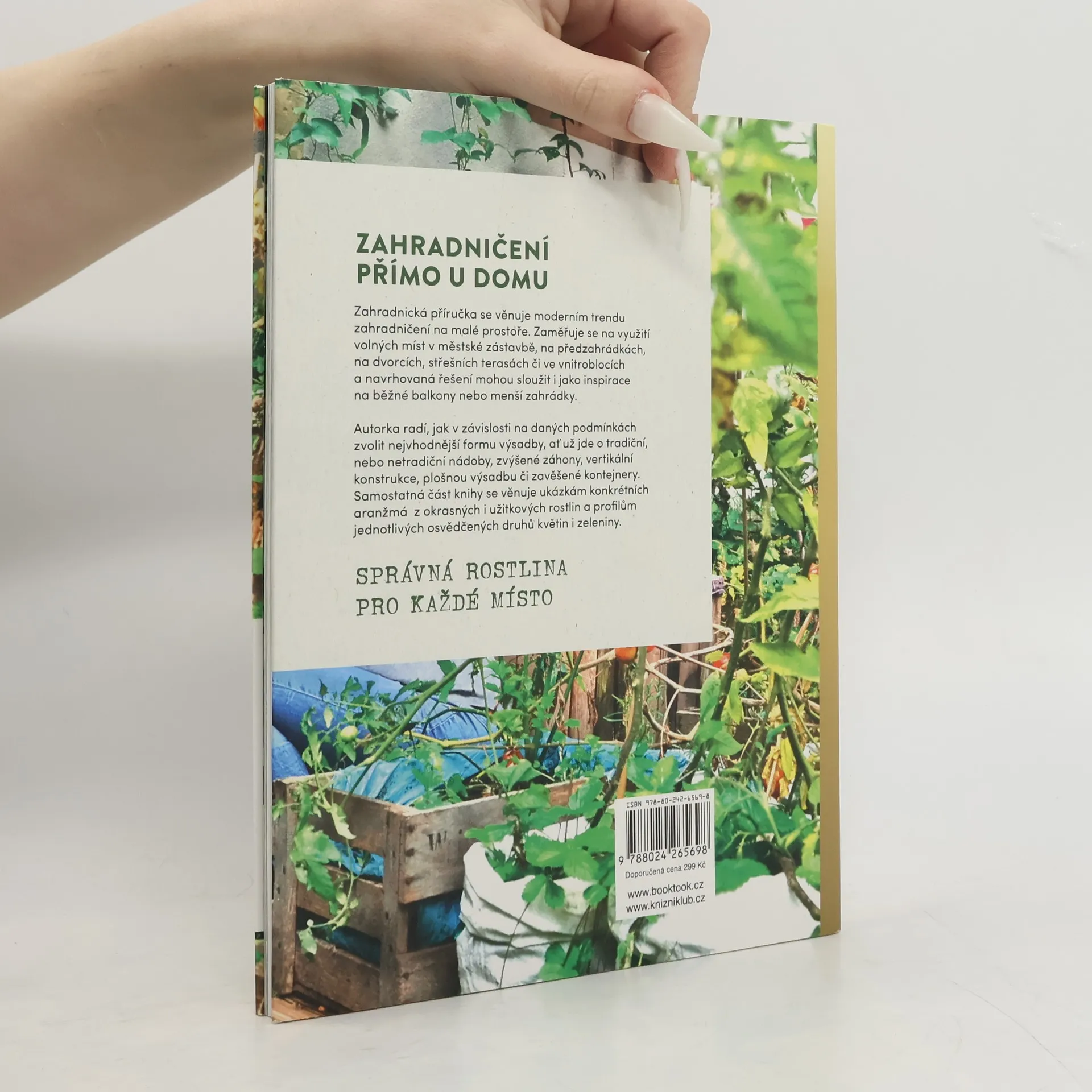 Zahradnická příručka se věnuje moderním trendu zahradničení na malé prostoře. Zaměřuje se na využití volných míst v městské zástavbě, na předzahrádkách, na dvorcích, střešních terasách či ve vnitroblocích a navrhovaná řešení mohou sloužit i jako inspirace na běžné balkony nebo menší zahrádky. Autorka radí, jak v závislosti na daných podmínkách zvolit nejvhodnější formu výsadby (ať už jde o tradiční, nebo netradiční nádoby, zvýšené záhony, vertikální konstrukce, plošnou výsadbu, zavěšené kontejnery ad.), typ půdy, způsob mulčování, techniku a frekvenci zálivky a přibližuje základy funkční kombinace druhů. Samostatná část knihy se věnuje ukázkám konkrétních aranžmá z okrasných i užitkových rostlin a profilům jednotlivých osvědčených druhů květin i zeleniny.