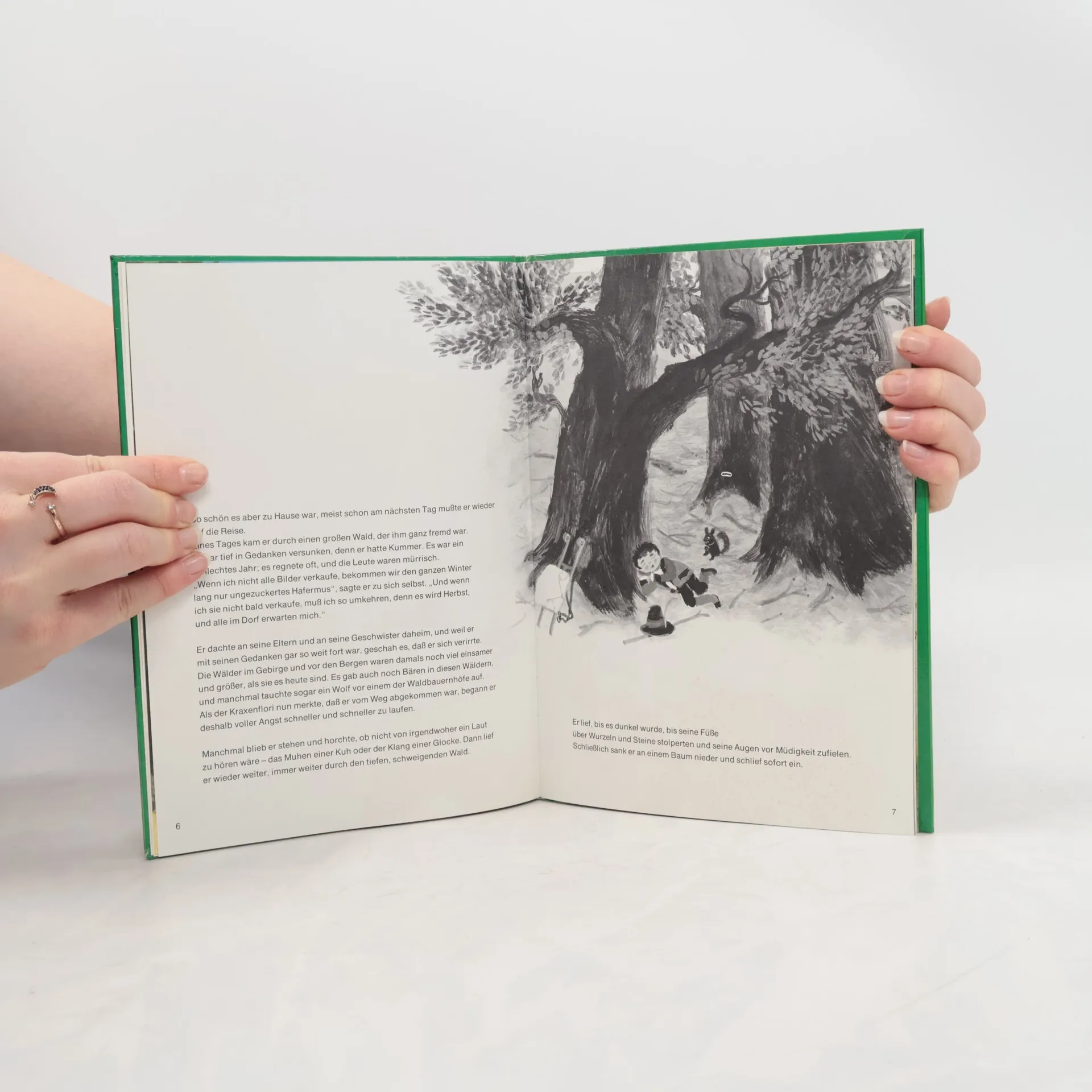 „Lagerfeuer brannten. Ganze Schweine und Hammel wurden über Spießen gebraten. Wilde Gesellen umsprangen die Feuer, soffen und fraßen übermäßig. Einige trommelten, geigten und bliesen auf Klarinetten, und dann wieder grölten alle miteinander wüste Lieder. Es musste eine Räuberbande sein, die hier im tiefen Wald ihr Versteck hatte …“ In unverwechselbaren Worten und Bildern erzählt Ali Mitgutsch vom dunklen Wald und seinen Gefahren. Doch der kleine Junge, den man Kraxenflori nennt, schlägt sich tapfer.