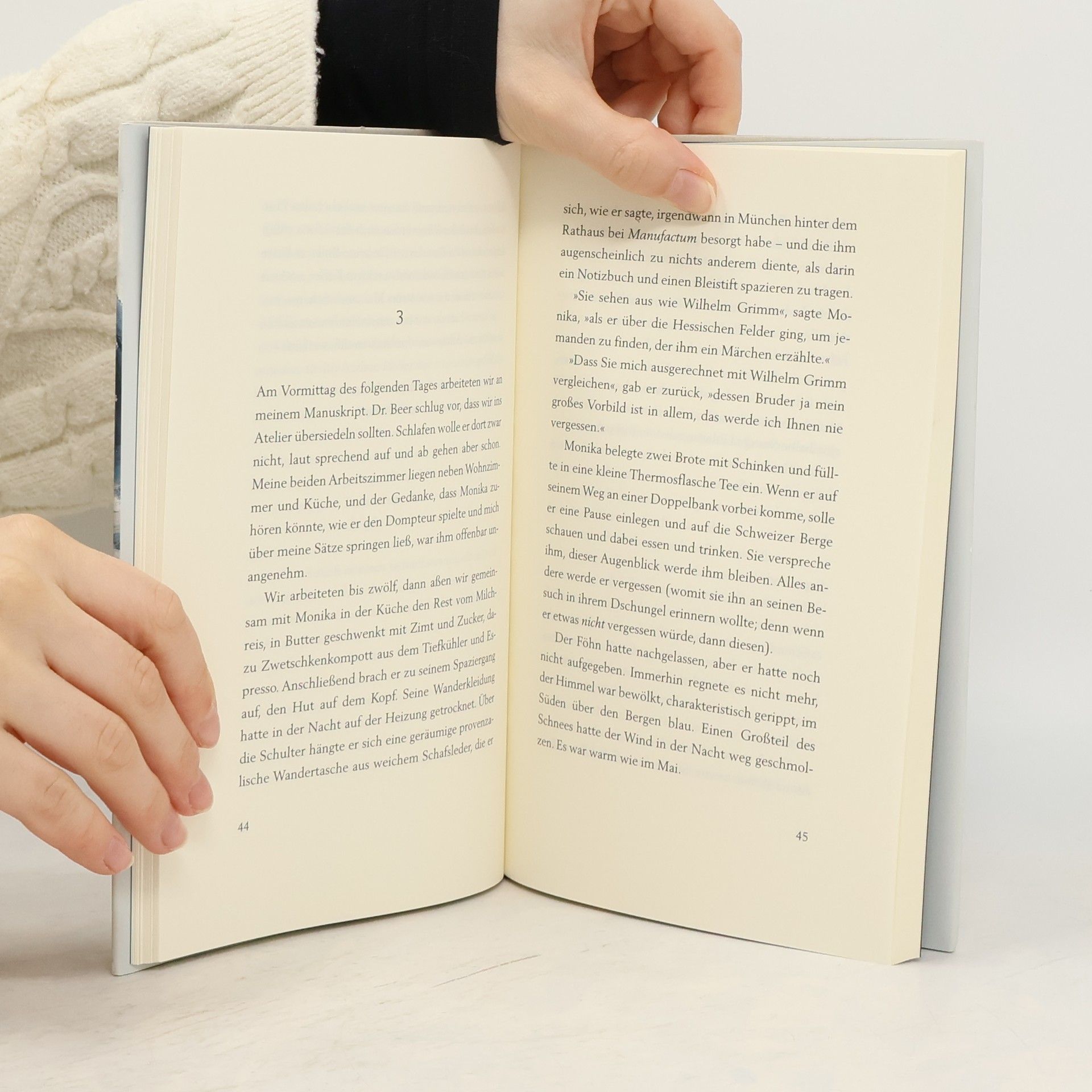 Alter Rhein. Zwei Männer spazieren am Ufer entlang, ins Gespräch vertieft. Es ist tiefer Winter, die Seitenarme des Flusses sind zugefroren, doch der Föhn spielt Frühling, es taut. Von weitem sehen die beiden einen großen schwarzen Hund über das Eis auf sie zulaufen. Plötzlich bricht er ins Eis ein. Der Hund kämpft um sein Leben. Einer der Männer holt Hilfe. Der andere, er ist Schriftsteller, bleibt alleine mit dem Hund. Er bricht einen großen Ast von einer Weide und kriecht auf diesem zu dem Hund. Er fasst ihn an den Vorderläufen. Der Hund verbeißt sich in seinem Ärmel. Er wird den Hund nicht retten können. Doch der Tod hat vor einigen Jahren eine so tiefe Wunde in sein Herz geschlagen, dass er ihm unter keinen Umständen dieses Leben überlassen will. Er hält den Hund verzweifelt fest, auch als der sich schon längst nicht mehr rührt. Michael Köhlmeier kann, was nicht viele können: in einer ganz kleinen Geschichte eine ganz große erzählen.