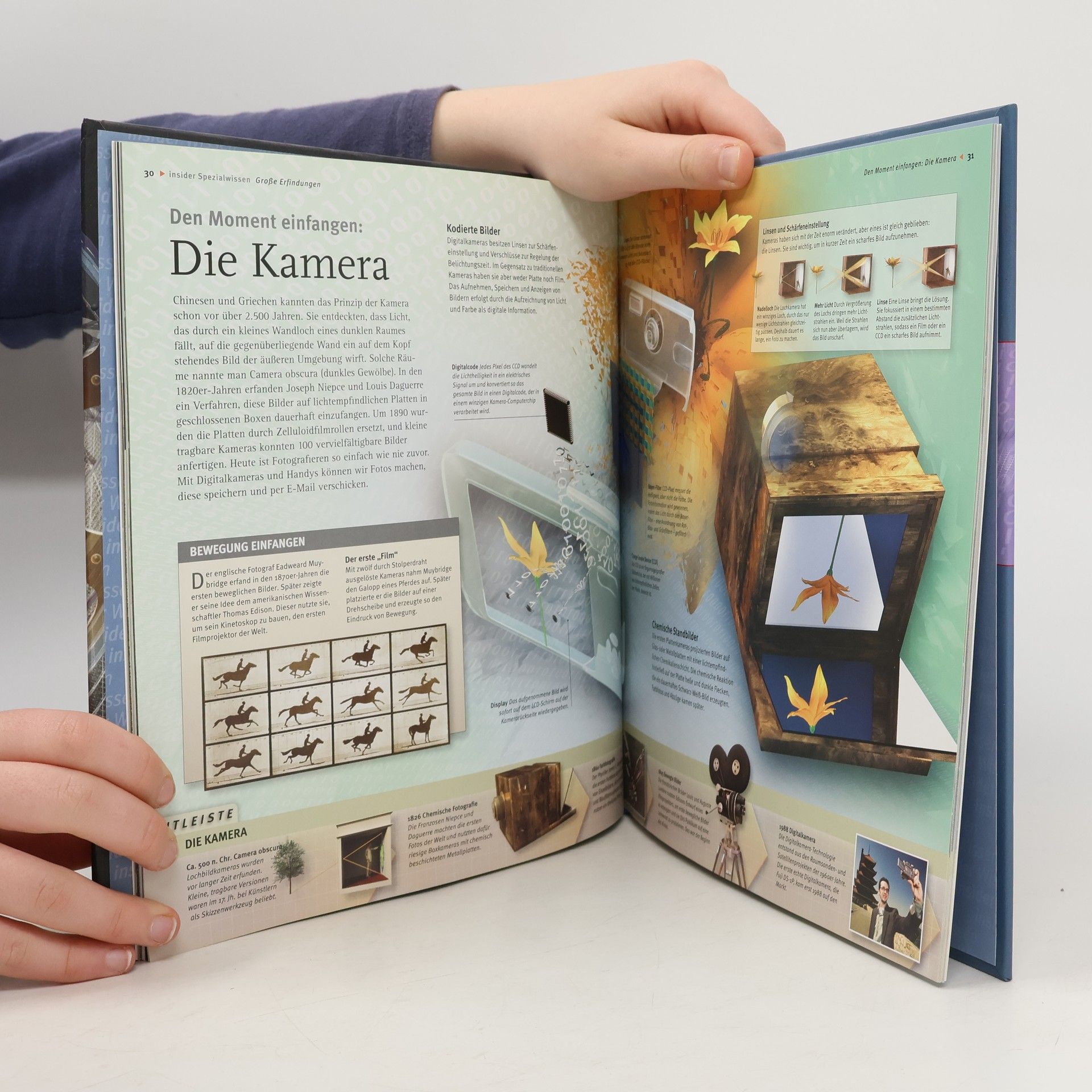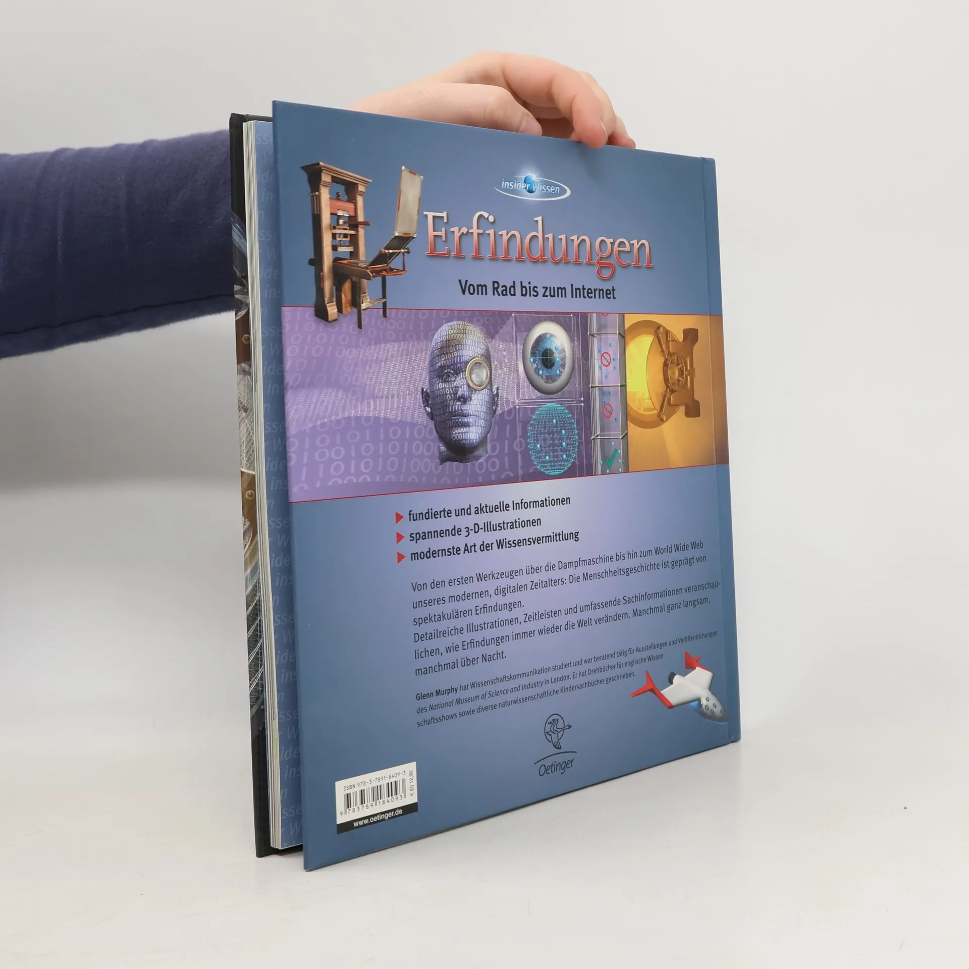 Von der Steinzeit bis zum Mikrochip – Erfindungen, die unser Leben veränderten Unglaublich, wie menschliche Erfindungen die Welt verändert haben. „Insider Wissen“ nimmt die Leser mit auf eine Zeitreise in die Vergangenheit, zeigt, welche Möglichkeiten sich durch die Erfindung des Rades eröffneten und wie groß der Lebensraum der Araber wurde, die die ersten Segel setzten. Auf dem Weg in die Gegenwart begegnen den Lesern Druckerpresse, Teleskop, Flugzeuge, die erste Organtransplantation und vieles mehr! Ein Buch voller Überraschungen – nicht nur für Kinder! Spannendes über Erfindungen aus allen Bereichen menschlichen Lebens, vor allem Transport, Energie, Telekommunikation und Medizin. Mit einer Zeitleiste bedeutender Erfindungen in den letzten 5000 Jahren und beeindruckenden 3D-Illustrationen.