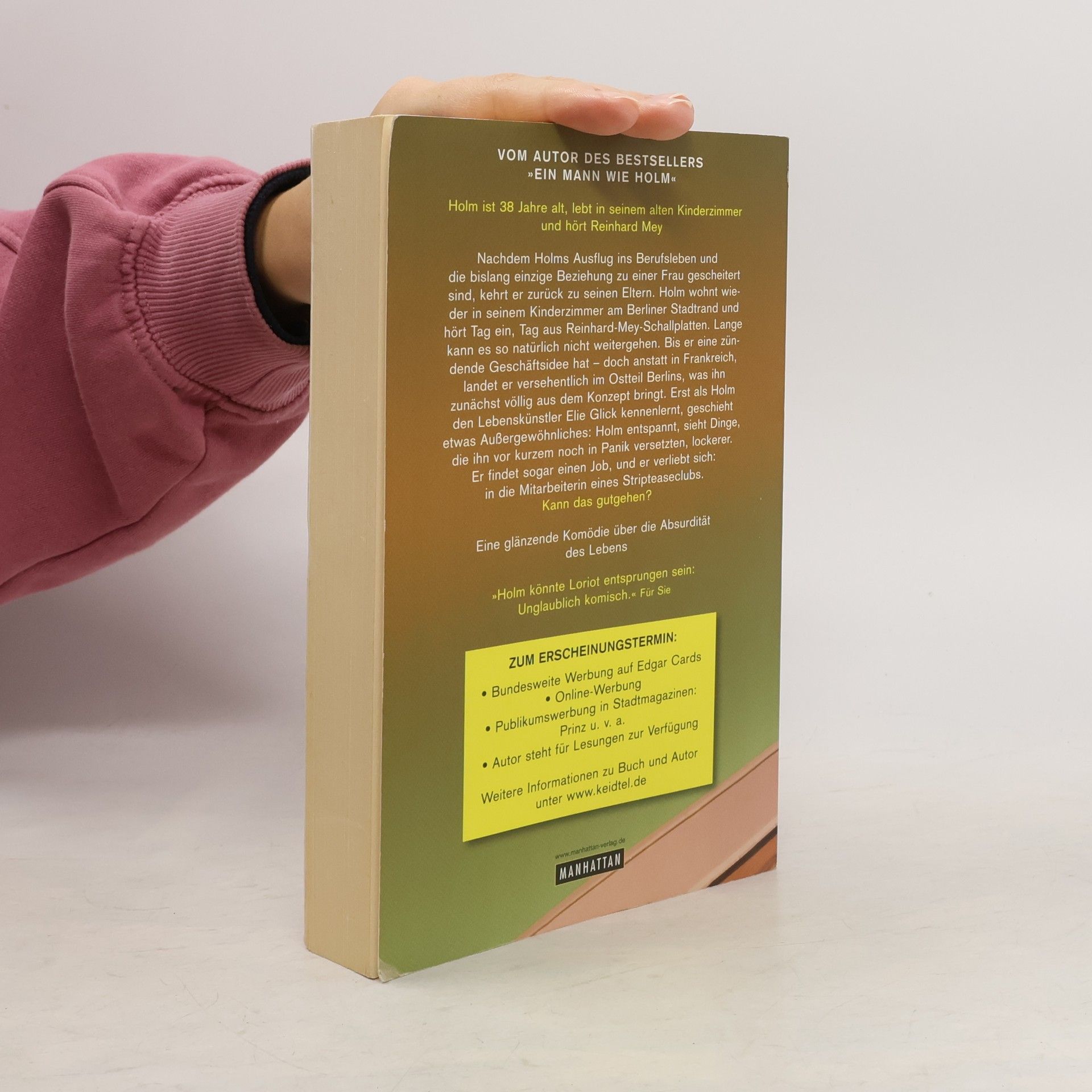 Helden wie Holm braucht das Land! Holm ist 38 Jahre alt, lebt in seinem alten Kinderzimmer und hört Reinhard Mey. Nachdem Holms Ausflug ins Berufsleben und die bislang einzige Beziehung zu einer Frau gescheitert sind, kehrt er zurück zu seinen Eltern. Zu Hause am Berliner Stadtrand wohnt Holm wieder in seinem Kinderzimmer und hört Tag ein Tag aus Reinhard-Mey-Schallplatten. Lange kann es so natürlich nicht weitergehen, und tatsächlich hat Holm schließlich eine zündende Geschäftsidee. Eigentlich sollte ihn diese nach Frankreich führen, stattdessen endet seine Reise aufgrund unglücklicher Umstände im Ostteil Berlins. Was ihn zunächst völlig aus dem Konzept bringt, erweist sich jedoch als Wink des Schicksals. Holm lernt den Lebenskünstler Elie Glick kennen, und plötzlich geschieht etwas Außergewöhnliches: Holm entspannt sich, sieht Dinge, die ihn vor kurzem noch in Panik versetzten, lockerer. Er findet sogar einen Job, und er verliebt sich: in die Mitarbeiterin eines Stripteaseclubs. Kann das gutgehen? Die langerwartete Fortsetzung des Überraschungserfolges 'Ein Mann wie Holm'.