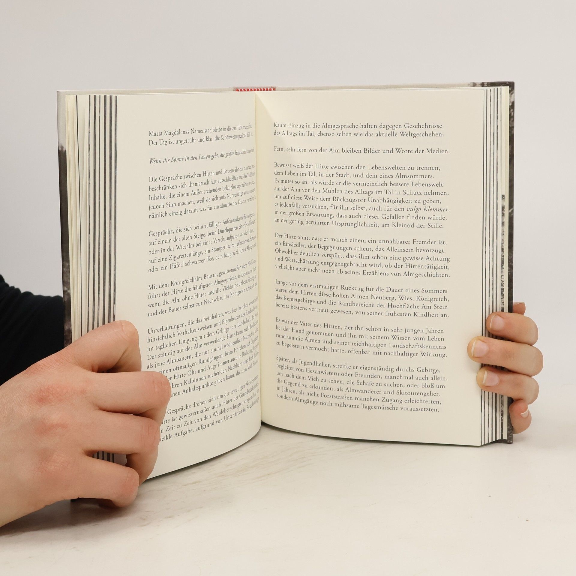 Der Hirte verbringt jeden Sommer mit einer Jungrinderherde auf einer Hochalm im Dachsteingebirge, die ihm seit Kindheit vertraut ist. Diese Alm liegt abgeschieden in einer rauen Karstlandschaft, fern von Wanderwegen und nur zu Fuß erreichbar, mit bescheidener Infrastruktur. Ein Fotograf begleitet den Hirten und dokumentiert dessen Leben in Schwarzweiß, wodurch das Alleinsein des Hirten in Zweisamkeit verwandelt wird. Das Werk zeigt auf authentische und stille Weise das Leben des Hirten, die umliegende Natur, das Wetter und verschiedene Almsommer-Aktivitäten. Es ist ein szenisches Tagebuch, das den Leser in eine archaische, vom Tourismus unberührte Lebenswelt eintauchen lässt. Über den Almsattel weht der Wind, und tatsächlich kommt und geht hier alles – Menschen und Nutztiere verändern temporär die Atmosphäre des Refugiums. Glockenklänge, Rinderrufe und Stimmen vermischen sich mit den Geräuschen der Natur. Der Hirte bewegt sich oft über den Almsattel, wenn er von Talmärschen, der Wasserquelle oder der Viehkontrolle zurückkehrt. Diese Erlebnisse und die Begegnungen während des Sommers prägen sein Leben in der Alm.