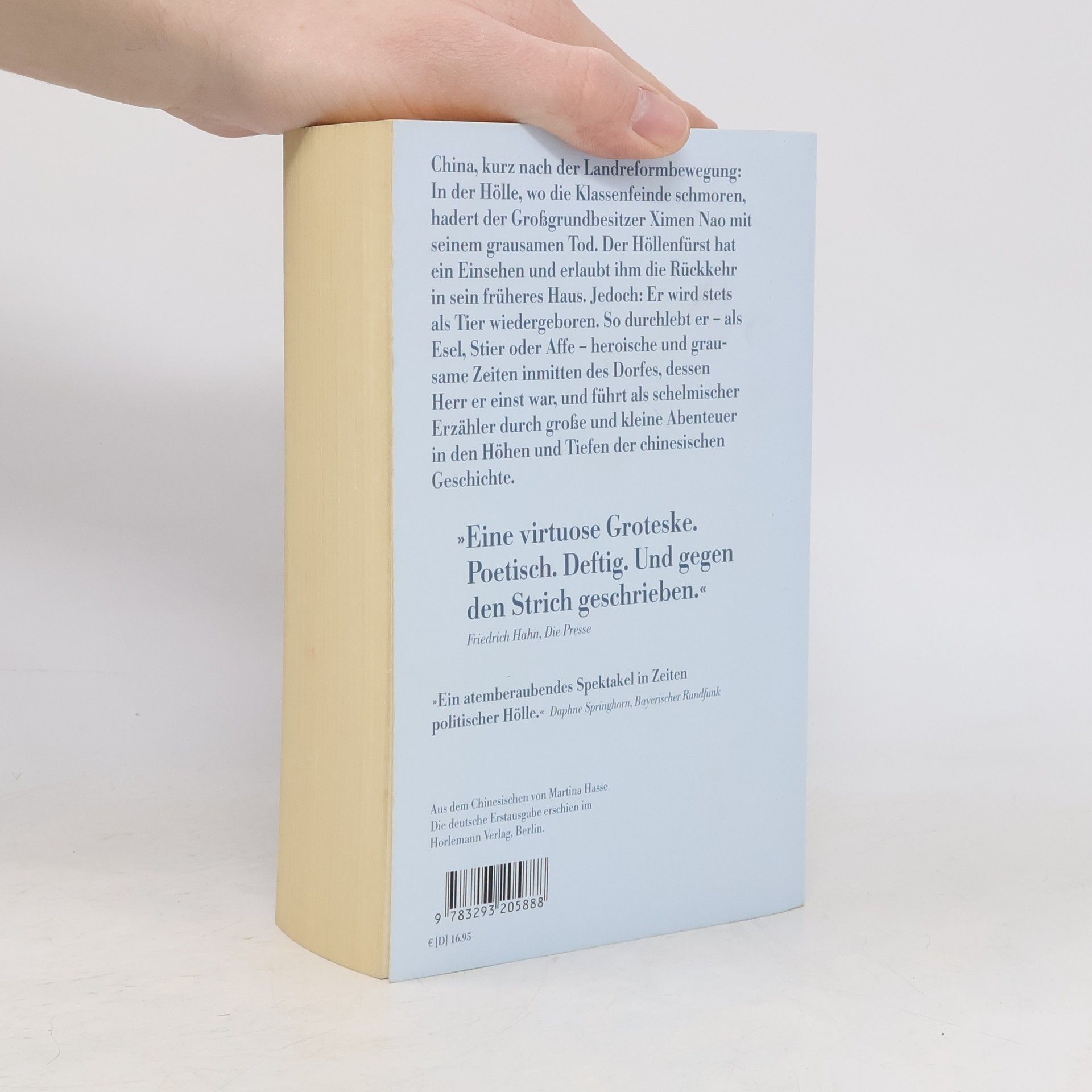In der Hölle, wo die Klassenfeinde schmoren, hadert der Großgrundbesitzer Ximen Nao mit seinem grausamen Tod. Der Höllenfürst Yama hat ein Einsehen und erlaubt ihm, in sein früheres Haus zurückzukehren. Doch welch ein Missgeschick, er wird als Esel wiedergeboren. Klug und willig dient er nun seinen früheren Untertanen. Doch auch dem Esel ist kein glückliches Leben beschieden, wieder und wieder wird er neu geboren – als kraftstrotzender Stier, als fruchtbarer Zuchteber, als oberschlauer Affe. So durchlebt er heroische und grausame Zeiten inmitten des Dorfes, dessen Herr er einst war. Mo Yans zutiefst menschlicher Roman ist ein funkelnder Bilderbogen, sprühend vor Komik und berührend durch Anteilnahme.