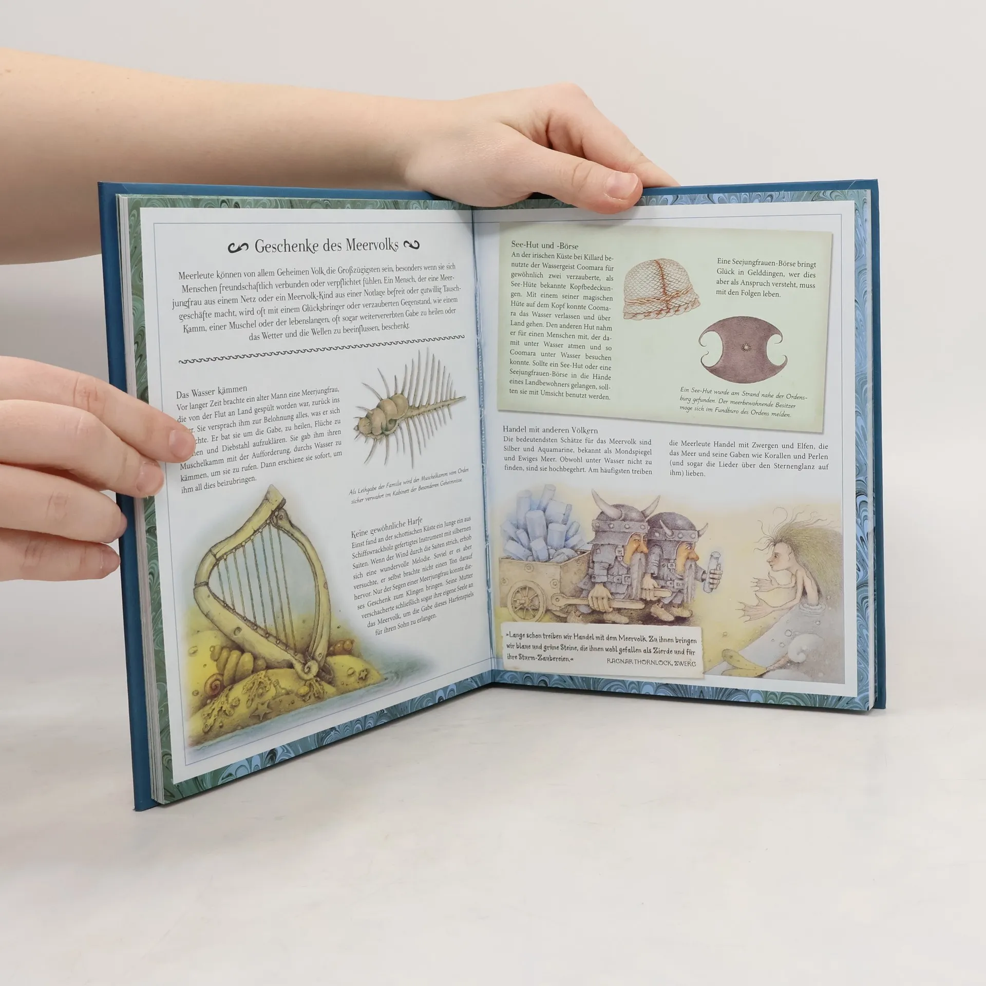 Hier erfährt man alles über Meerjungfrauen: Sagen, Legenden und Märchen, angebliche Fundstücke und Landkarten. Die einen sagen, sie seien längst ausgestorben. Die anderen sagen, es habe sie nie gegeben. Wir aber sagen: Augen auf! Der Orden des Goldenen Federkiels hat uns seine Kenntnisse über das geheime Meervolk anvertraut. Wir tauchen ab in eine Unterwasserwelt und ein in die Welt dieser Wesen, erforschen ihre Städte, ihre Magie, ihre Gebräuche. Und ihren einmaligen Wissensschatz über die Tiefen des Meeres. Jede Seite ist mit detaillierten Illustrationen und Zeichnungen geschmückt, hinter zahlreichen Klappen verstecken sich überraschende Informationen. Ein liebevoll gestaltetes Geschenk, das kleinen und großen Lesern gefallen wird!