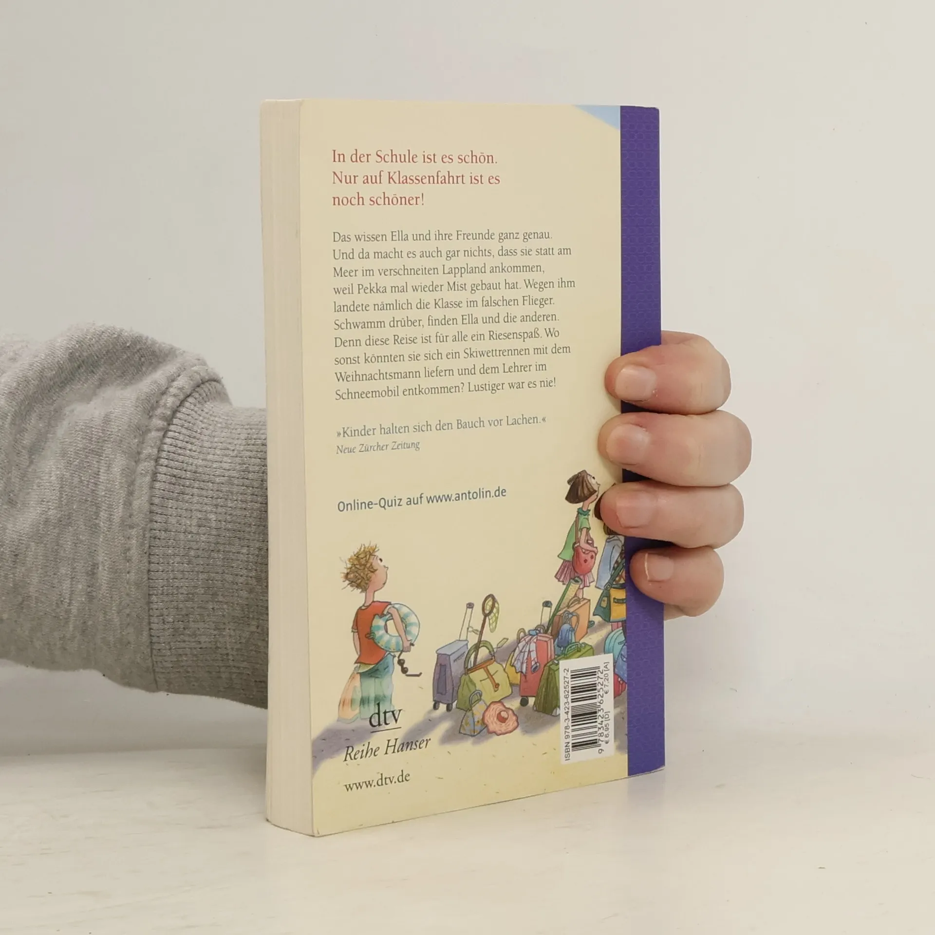 Das dritte Ella-Abenteuer  In der Schule ist es schön, weil dort so viele lustige Sachen passieren. Nur auf Klassenfahrt ist es noch schöner. Eigentlich sollte die Reise in den Süden gehen, wo es einen Sandstrand und Liegestühle und extragroße Eisportionen gibt. Ellas Klasse hat den Wettbewerb um das lustigste Klassenfoto gewonnen, und die Reise war der erste Preis. Sie haben nur leider den falschen Flieger erwischt. Und jetzt sind alle zusammen in Kittikä, statt irgendwo im Süden, gelandet. Das liegt in Lappland, wo es im Mai noch schneit, ungefähr dort, wo der Weihnachtsmann wohnen soll. Was Ella und ihre Freunde dort erleben und wie sie wieder nach Hause kommen, davon erzählt das dritte ›Ella‹-Buch. Zu diesem Buch finden Sie Quizfragen auf antolin. de