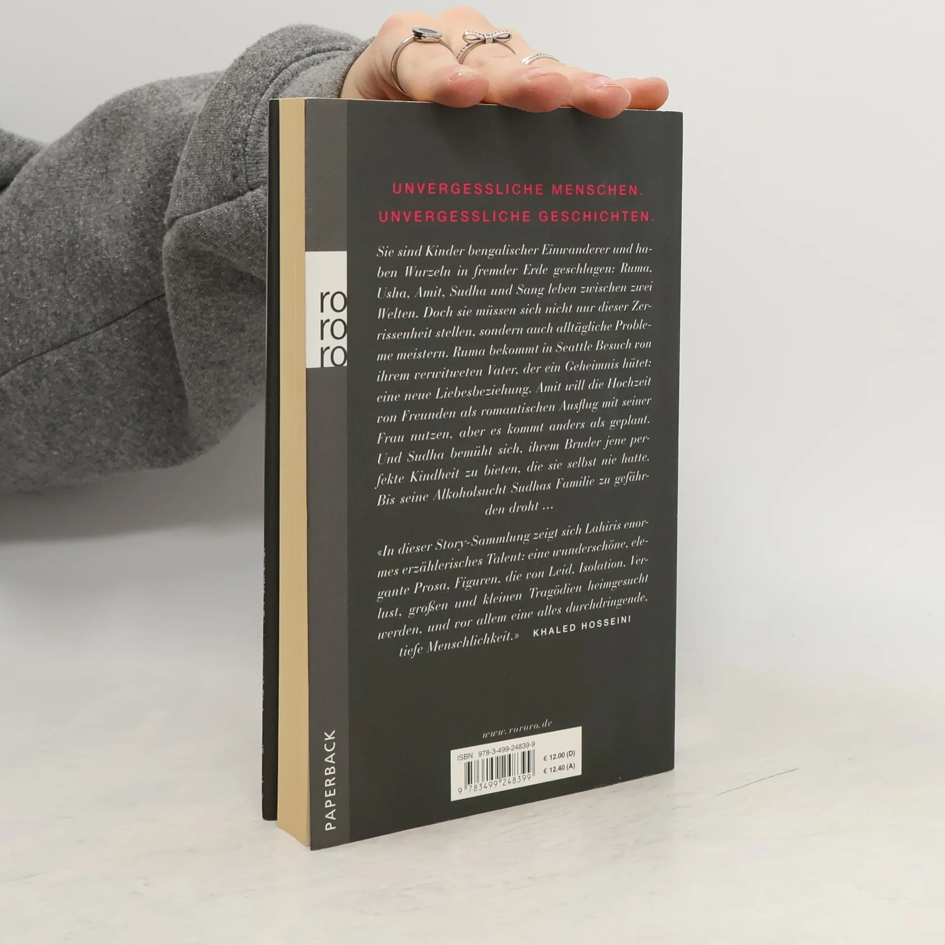 Unvergessliche Menschen. Unvergessliche Geschichten. Sie sind Kinder bengalischer Einwanderer und haben Wurzeln in fremde Erde geschlagen: Ruma, Usha Amit, Sudha und Sang leben zwischen zwei Welten, sie sind in unterschiedlichen Traditionen zu Hause. Doch sie müssen sich nicht nur dieser Zerrissenheit stellen, sondern auch alltägliche Probleme und Herausforderungen meistern. Ruma bekommt in Seattle Besuch von ihrem verwitweten Vater, der ein Geheimnis vor ihr hütet: eine neue Liebesbeziehung. Amit will die Hochzeit von Freunden als romantischen Wochenendflug mit seiner Frau Megan nutzen, doch es kommt anders als geplant. Und Sudha bemüht sich, ihrem jüngeren Bruder jene perfekte Kindheit zu bieten, die sie selbst nie hatte. Bis Schuldgefühle, Schmerz und Wut überhand nehmen, als seine Alkoholsucht Sudhas Familie zu gefährden droht … «In dieser Story-Sammlung zeigt sich Lahiris enormes erzählerisches Talent: eine wunderschöne, elegante Prosa, Figuren, die von Leid, Isolation, Verlust, großen und kleinen Tragödien heimgesucht werden, und vor allem eine alles durchdringende, tiefe Menschlichkeit.» (Khaled Hosseini)