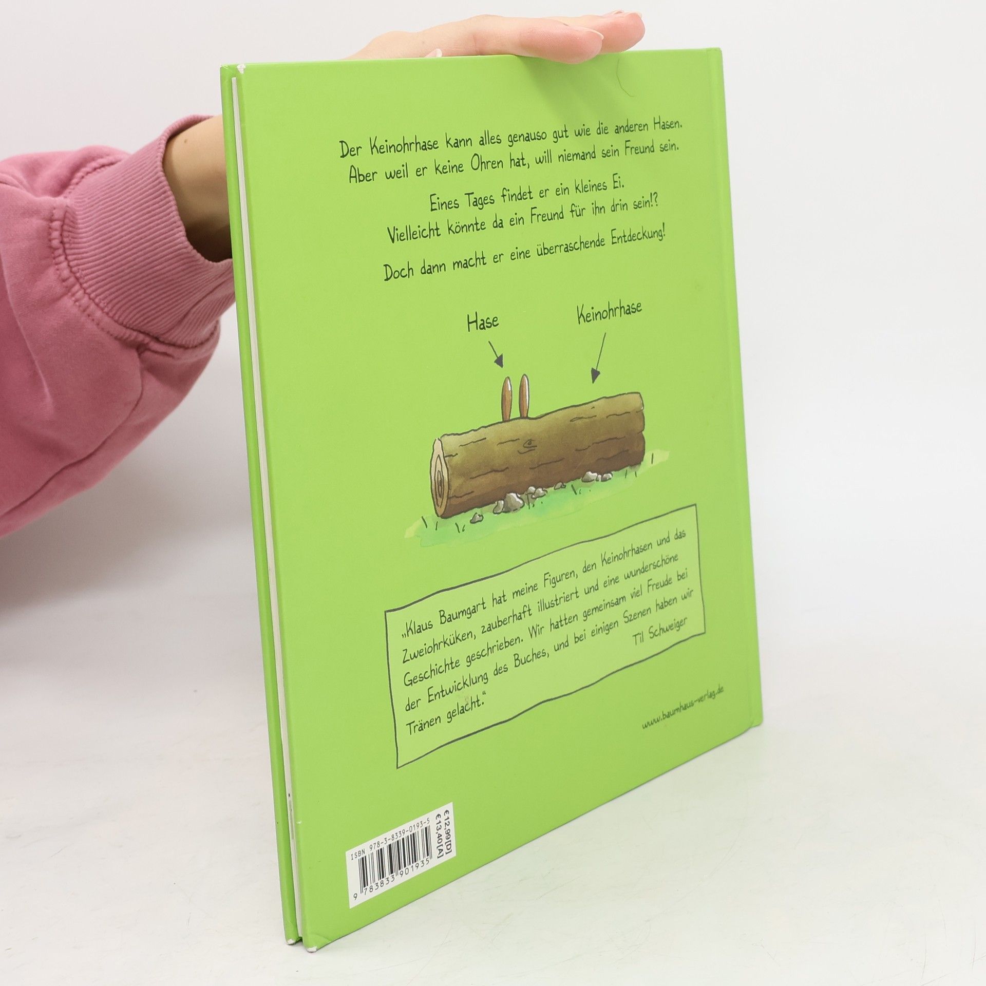 Der Keinohrhase kann alles genauso gut wie die anderen Hasen. Aber weil er keine Ohren hat, will niemand sein Freund sein und er ist daher sehr traurig. Eines Tages findet er ein kleines Ei. Wem mag es gehören? Vielleicht könnte da ein Freund für ihn drin sein? Dann macht er eine überraschende Entdeckung... Erfolgsautor Klaus Baumgart (Erfinder von Lauras Stern) hat in Zusammenarbeit mit Til Schweiger (Vater des Keinohrhasen) ein wunderbares Bilderbuch geschaffen, in dem er die herzergreifende Geschichte der zwei liebevollen Figuren erzählt.
