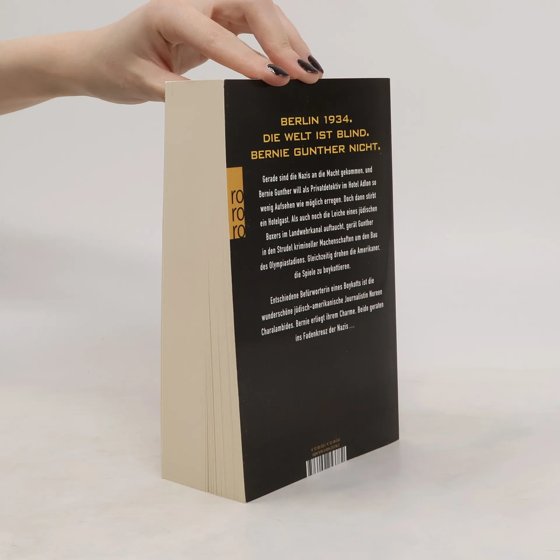 BERLIN 1934. DIE WELT IST BLIND. BERNIE GUNTHER NICHT. Gerade sind die Nazis an die Macht gekommen, und Bernie Gunther will als Privatdetektiv im Hotel Adlon so wenig Aufsehen wie möglich erregen. Doch dann stirbt ein Hotelgast. Als auch noch die Leiche eines jüdischen Boxers im Landwehrkanal auftaucht, gerät Gunther in den Strudel krimineller Machenschaften um den Bau des Olympiastadions. Gleichzeitig drohen die Amerikaner, die Spiele zu boykottieren. Entschiedene Befürworterin eines Boykotts ist die wunderschöne jüdisch-amerikanische Journalistin Noreen Charalambides. Bernie erliegt ihrem Charme. Beide geraten ins Fadenkreuz der Nazis ...