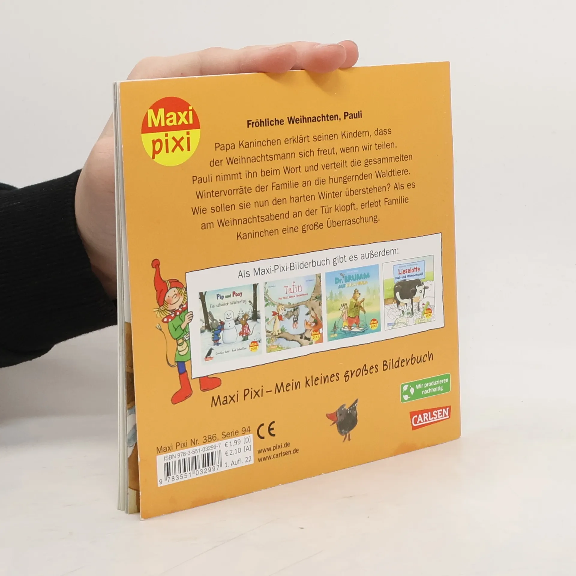 Papa Kaninchen erklärt seinen Kindern, dass der Weihnachtsmann sich freut, wenn wir teilen. Pauli nimmt ihn beim Wort und verteilt die gesammelten Wintervorräte der Familie an die hungernden Waldtiere. Wie sollen sie nun den harten Winter überstehen? Als es am Weihnachtsabend an der Tür klopft, erlebt Familie Kaninchen eine große Überraschung. Maxi Pixi – die kleinen großen Bilderbücher im Softcover.