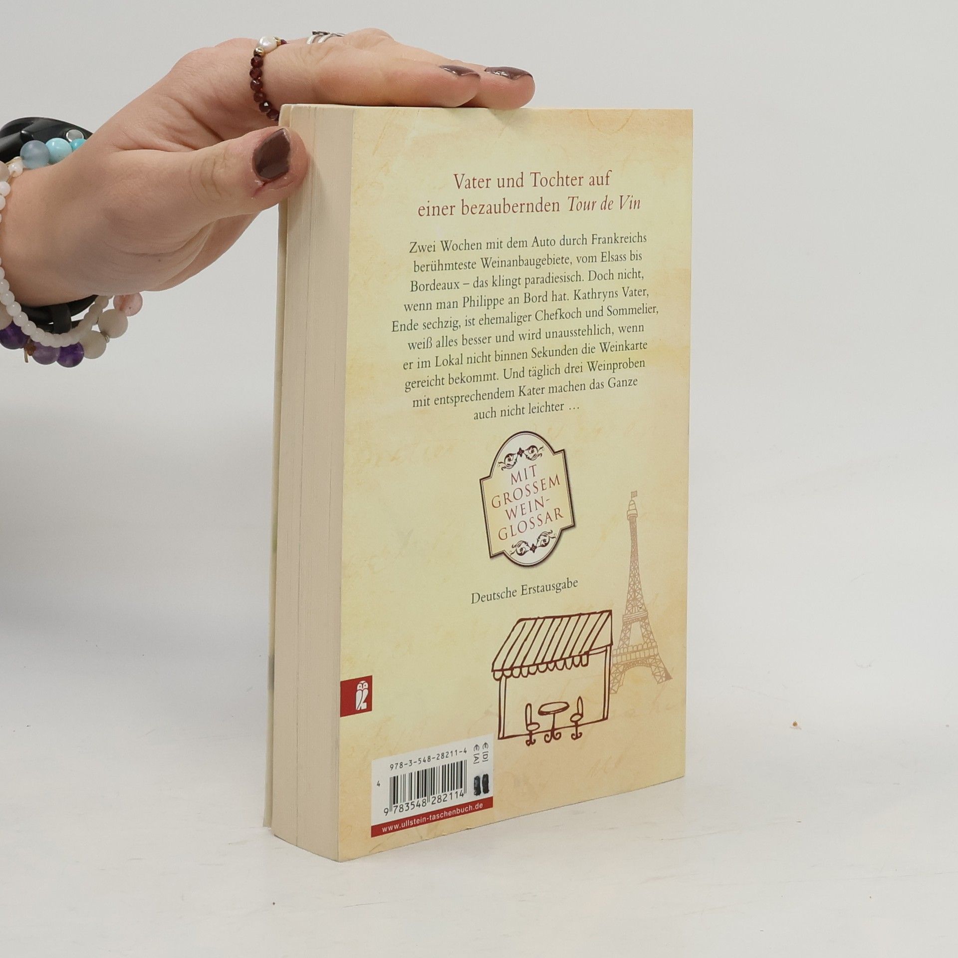 Zwei Wochen mit dem Auto durch Frankreichs berühmteste Weinanbaugebiete, vom Elsass bis nach Bordeaux - das klingt paradiesisch. Doch nicht, wenn man Philippe an Bord hat. Kathryns Vater, Ende sechzig, ist ehemaliger Chefkoch und Sommelier, weiß alles besser und wird unausstehlich, wenn er im Lokal nicht binnen Sekunden die Weinkarte gereicht bekommt. Und täglich drei Weinproben mit entsprechendem Kater machen das Ganze auch nicht leichter.