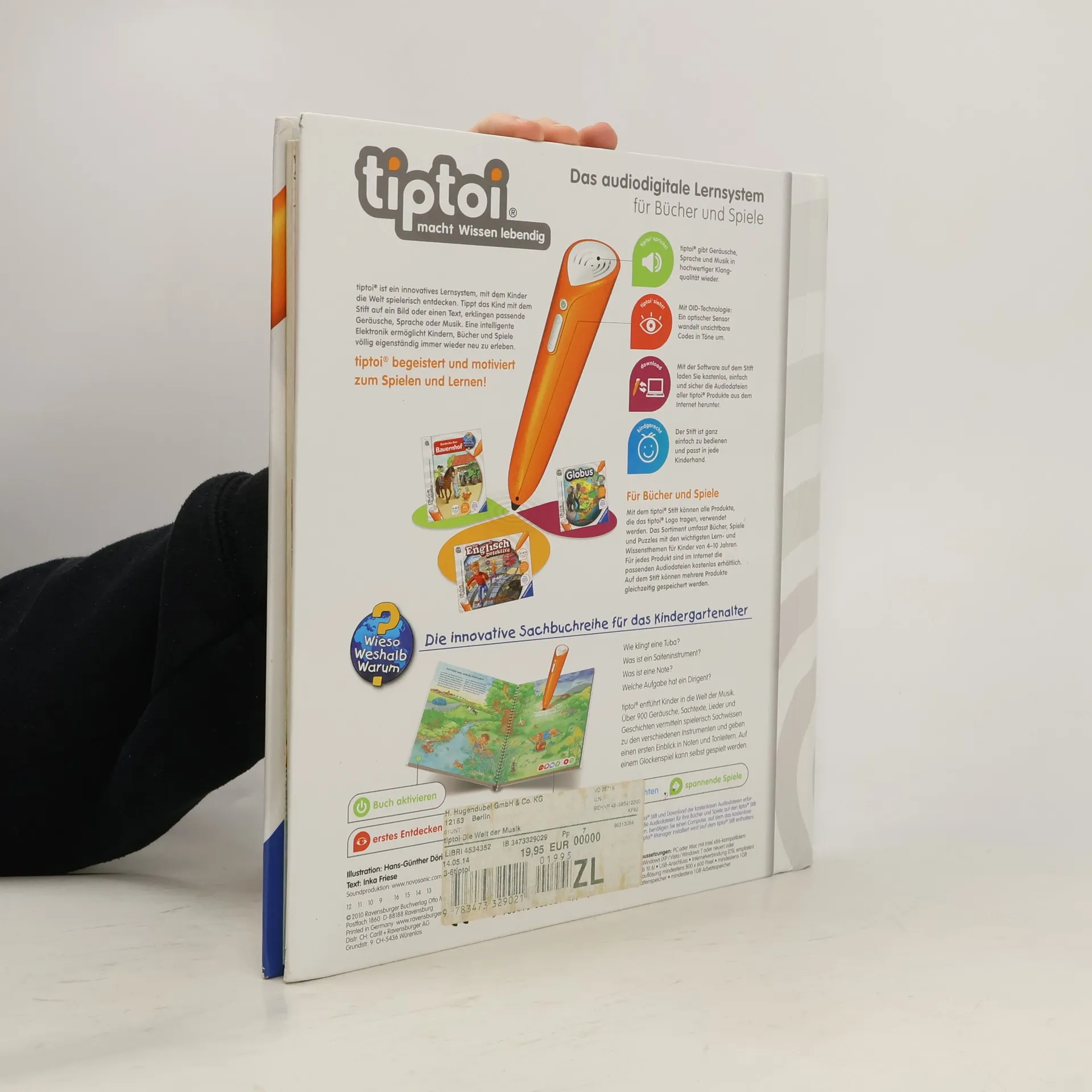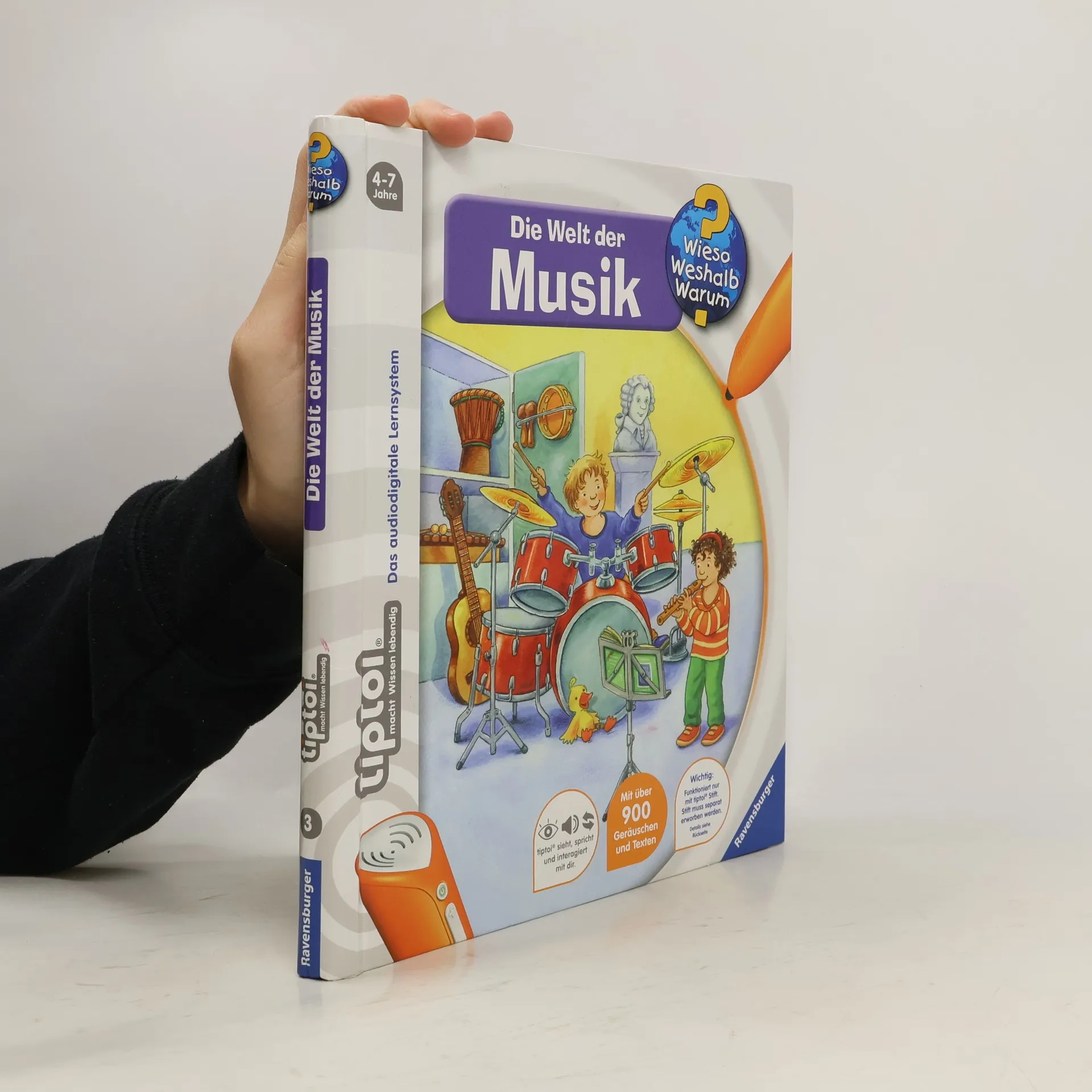 Ohren auf: Willkommen in der Welt der Musik! Dieses Buch steckt voller Musik: vom Basiswissen darüber, wie der Ton in unser Ohr kommt, über die verschiedenen Musikinstrumente bis hin zu der Frage, was Rhythmus ist. Außerdem kann mit dem tiptoi-Stift auf einem Xylophon gespielt und einem richtigen Orchester gelauscht werden. Was macht der Traktor auf dem Feld? Wann kommt die Feuerwehr? Wie groß wird ein Pony? Die interaktive Sachbuchreihe tiptoi Wieso? Weshalb? Warum? beantwortet wichtige Kinderfragen auf Augenhöhe. Auf den liebevoll illustrierten Seiten tauchen die Kinder in eine Welt ein, die durch zahlreiche authentische Geräusche lebendig wird. Das Sachwissen wird altersgerecht erklärt und ist fachlich geprüft. Die Kinder können sich dank der einfachen und intuitiven Nutzung mit dem tiptoi-Stift das Wissen selbst erschließen. Sie lernen, Zusammenhänge zu begreifen und erfahren spannende Informationen über ihren Alltag und ihre Umwelt. Tolle Geschichten, Lieder und unterhaltsame Spiele laden dabei immer wieder zum selbstständigen Entdecken und Erforschen ein. tiptoi-Stift nicht enthalten. Muss separat erworben werden.