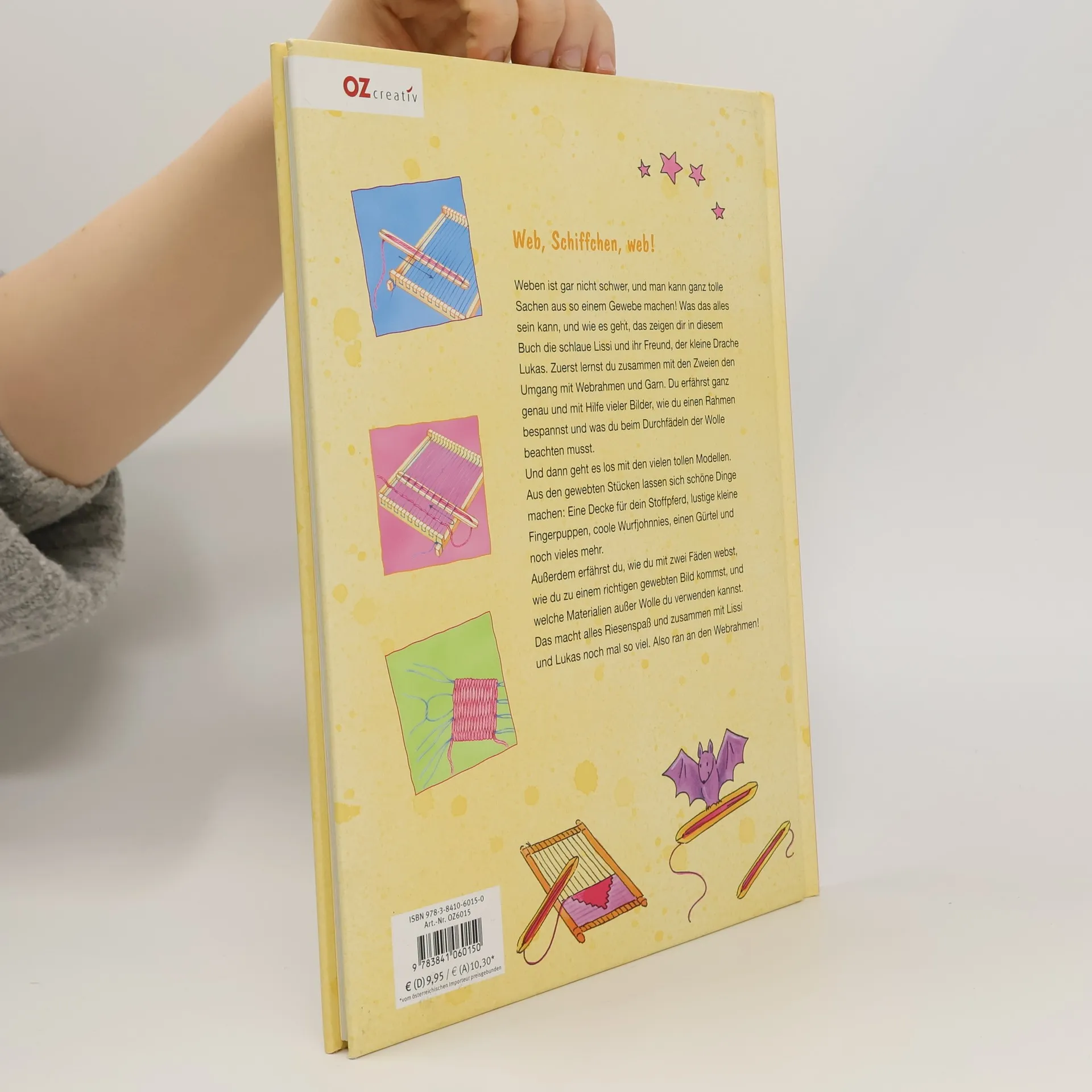 Weben ist gar nicht schwer, und man kann ganz tolle Sachen aus so einem Gewebe machen! Was das alles sein kann, und wie es geht, das zeigen dir in diesem Buch die schlaue Lissi und ihr Freund, der kleine Drache Lukas. Zuerst lernst du zusammen mit den Zweien den Umgang mit Webrahmen und Garn. Du erfährst ganz genau und mit Hilfe vieler Bilder, wie du einen Rahmen bespannst und was du beim Durchfädeln der Wolle beachten musst. Und dann geht es los mit den vielen tollen Modellen. Aus den gewebten Stücken lassen sich viele schöne Dinge machen: Eine Decke für dein Stoffpferd, lustige kleine Fingerpuppen, coole Wurfjohnnies, einen Gürtel und noch vieles mehr. Außerdem erfährst du, wie du mit zwei Fäden webst, wie du zu einem richtigen gewebten Bild kommst, und welche Materialien außer Wolle du verwenden kannst. Das macht alles Riesenspaß und zusammen mit Lissi und Lukas noch mal so viel. Also ran an den Webrahmen und viel Spaß!