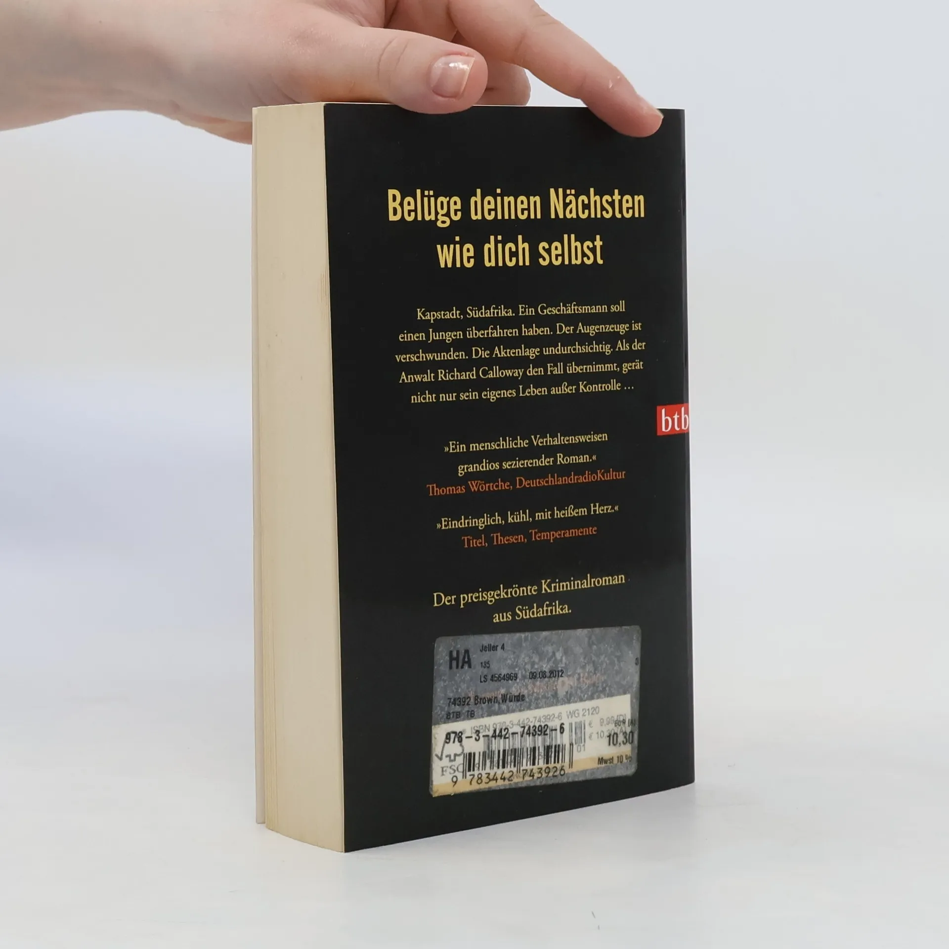Belüge deinen Nächsten wie dich selbst Kapstadt, die Mutterstadt Südafrikas, die Schöne mit den vielen Gesichtern. Während im Schatten des Tafelbergs Flüchtlinge ums Überleben kämpfen und korrupte Polizisten ihr Gehalt aufbessern, frisst der Alltag an Richard Calloways Glück. Doch dann übernimmt der Anwalt einen Fall, der sein Leben für immer verändern wird: Ein Geschäftsmann soll einen Jungen überfahren haben. Der Augenzeuge ist verschwunden, die Aktenlage undurchsichtig. Als Richard dann auch noch auf die nigerianische Einwanderin Abayomi trifft, wagt er sich Schritt für Schritt hinaus aus seinem Alltag. Doch auch der kleinste Schritt kann ein Schritt zu viel sein. Und manchmal gerät man in einen Strudel, aus dem es kein Entkommen gibt …
