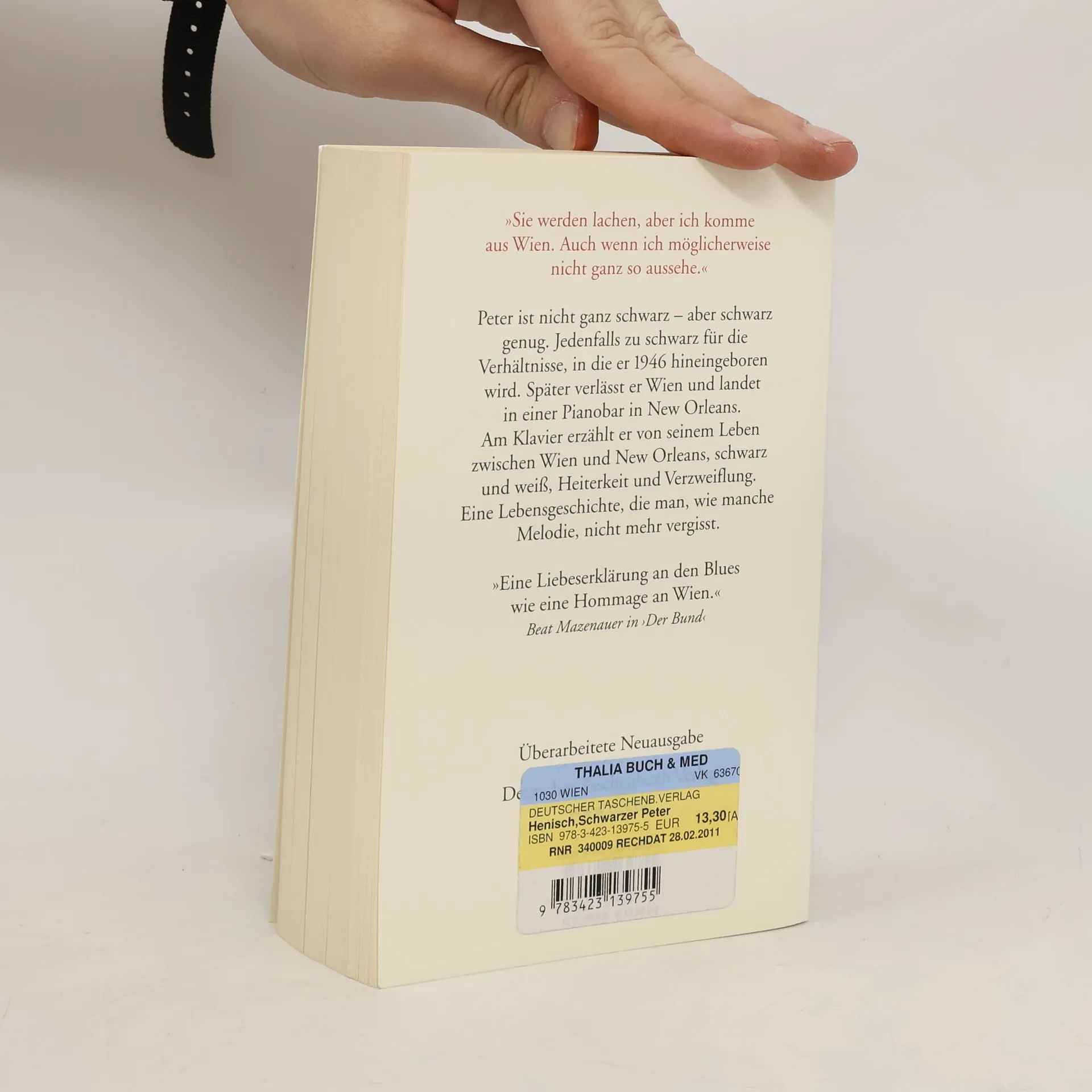 Ein umfangreicher Roman vom Etwas-Anders-Sein Peter ist nicht ganz schwarz – aber schwarz genug. Jedenfalls zu schwarz für die Verhältnisse, in die er 1946 als Sohn einer Wiener Schaffnerin und eines US-Soldaten hineingeboren wird. Später verlässt er Wien und landet in einer Pianobar in New Orleans. Am Klavier erzählt er sein Leben. Wien und New Orleans, schwarz und weiß, Heiterkeit und Verzweiflung sind Kontrapunkte einer Geschichte, die man, wie manche Melodien, nicht mehr vergisst.