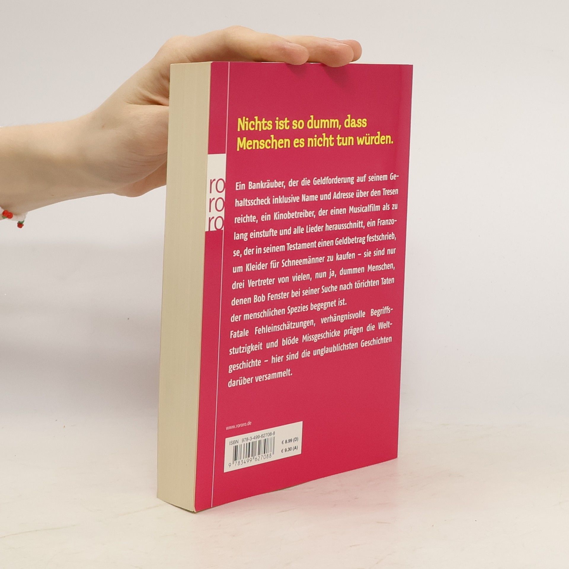 Nichts ist so dumm, dass Menschen es nicht tun würden. Ein Bankräuber, der die Geldforderung auf seinem Gehaltsscheck inklusive Name und Adresse über den Tresen reichte, ein Kinobetreiber, der einen Musicalfilm als zu lang einstufte und alle Lieder herausschnitt, ein Franzose, der in seinem Testament einen Geldbetrag festschrieb, um Kleider für Schneemänner zu kaufen – sie sind nur drei Vertreter von vielen, nun ja, dummen Menschen, denen Bob Fenster bei seiner Suche nach törichten Taten der menschlichen Spezies begegnet ist. Fatale Fehleinschätzungen, verhängnisvolle Begriffsstutzigkeit und blöde Missgeschicke prägen die Weltgeschichte – hier sind die unglaublichsten Geschichten darüber versammelt.