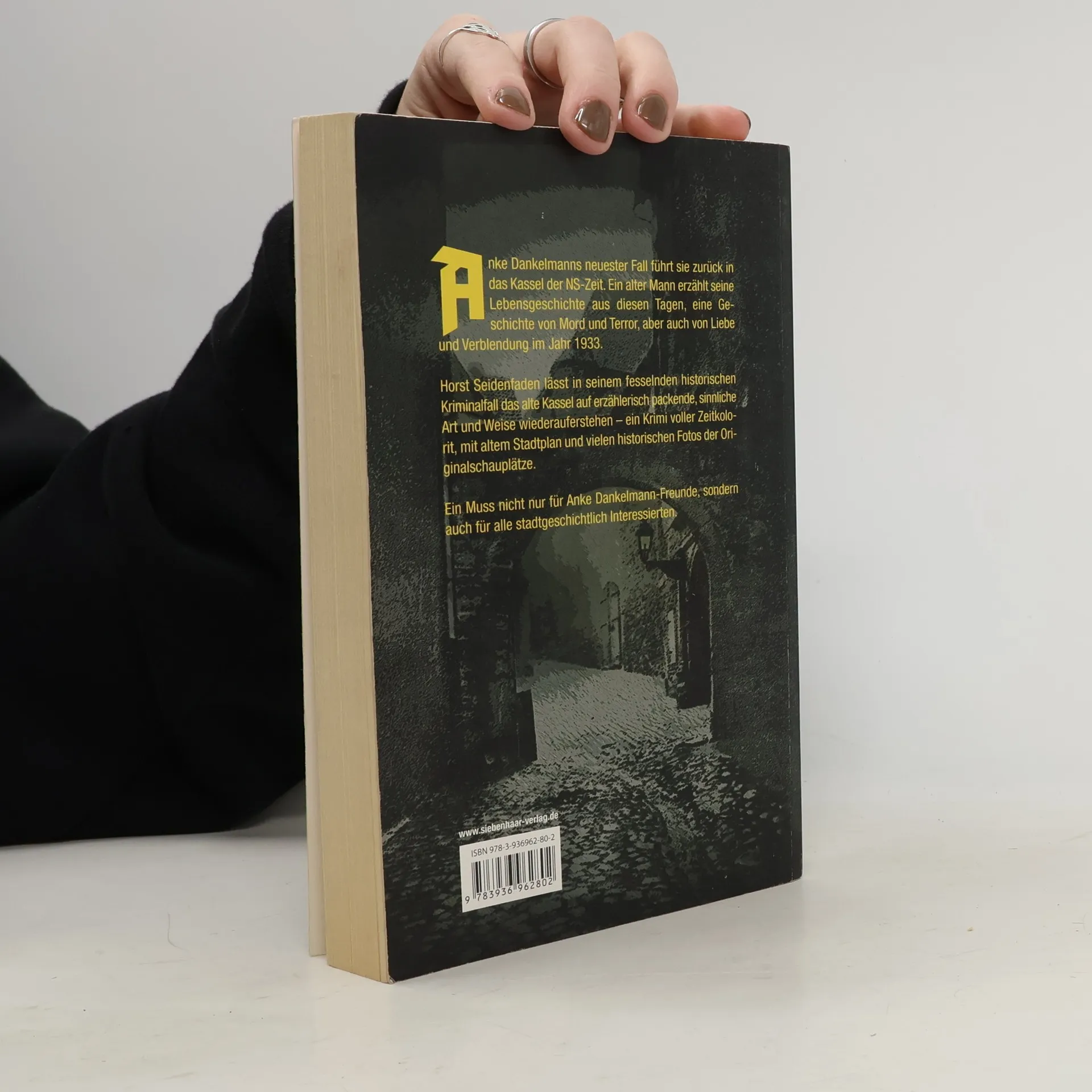 Anke Dankelmanns neuester Fall führt sie zurück in das Kassel der NS-Zeit. Ein alter Mann erzählt seine Lebensgeschichte aus diesen Tagen, eine Geschichte von Mord und Terror, aber auch von Liebe und Verblendung im Jahr 1933. Horst Seidenfaden lässt in seinem fesselnden historischen Kriminalfall das alte Kassel auf erzählerisch packende, sinnliche Art und Weise wiederauferstehen – ein Krimi voller Zeitkolorit, mit altem Stadtplan und vielen historischen Fotos der Originalschauplätze. Ein Muss nicht nur für Anke Dankelmann-Freunde, sondern auch für alle stadtgeschichtlich Interessierten.