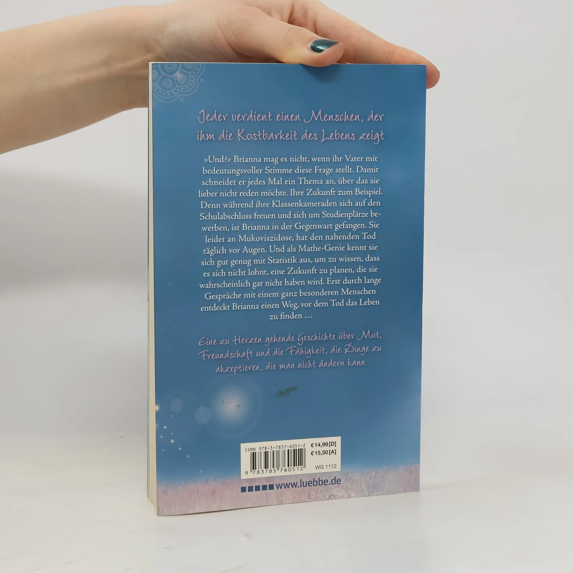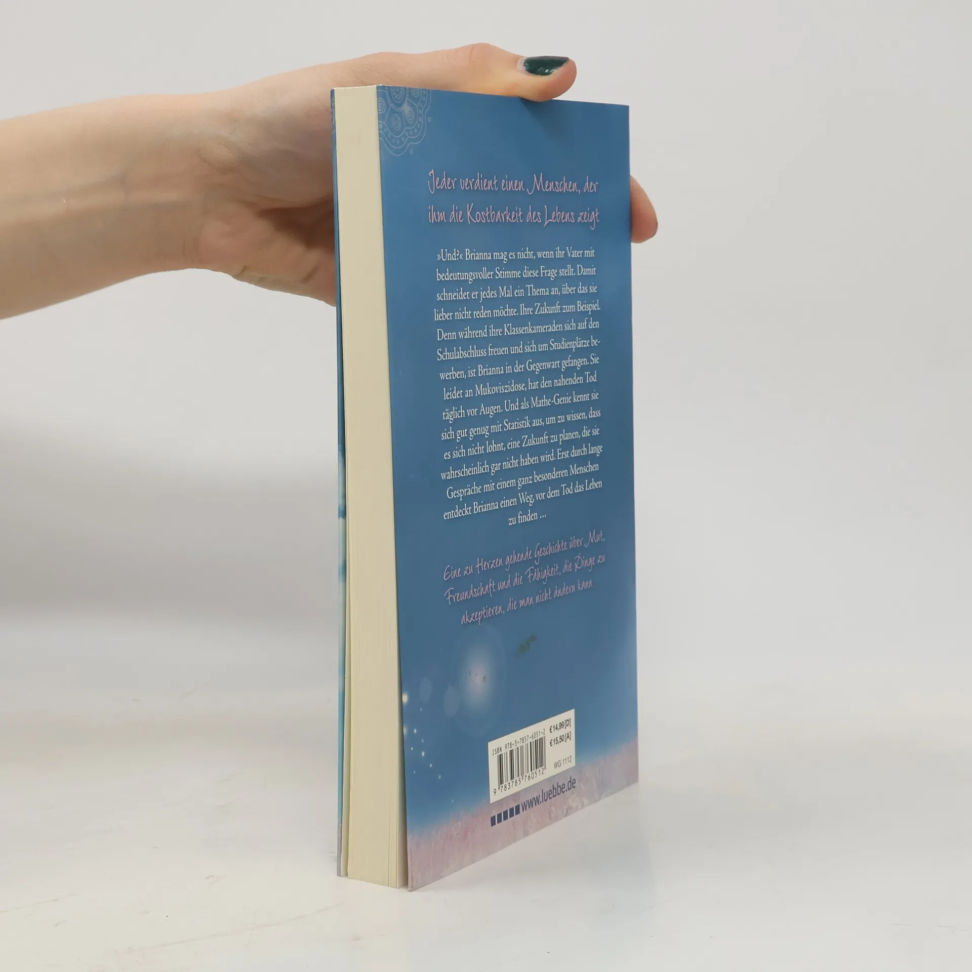 „Und?“ Brianna mag es nicht, wenn ihr Vater mit bedeutungsvoller Stimme diese Frage stellt. Damit schneidet er jedes Mal ein Thema an, über das sie lieber nicht reden möchte. Ihre Zukunft zum Beispiel. Denn während all ihre Schulkameraden sich auf den Abschluss freuen und sich um Studienplätze bewerben, ist Brianna in der Gegenwart gefangen. Sie leidet an Mukoviszidose. Und als Mathe-Genie kennt sie sich gut genug mit Statistik aus, um zu wissen, dass es sich nicht lohnt, eine Zukunft zu planen, die sie wahrscheinlich gar nicht haben wird. Erst durch lange Gespräche mit einem ganz besonderen Menschen, entdeckt Brianna einen Weg, vor dem Tod das Leben zu finden -