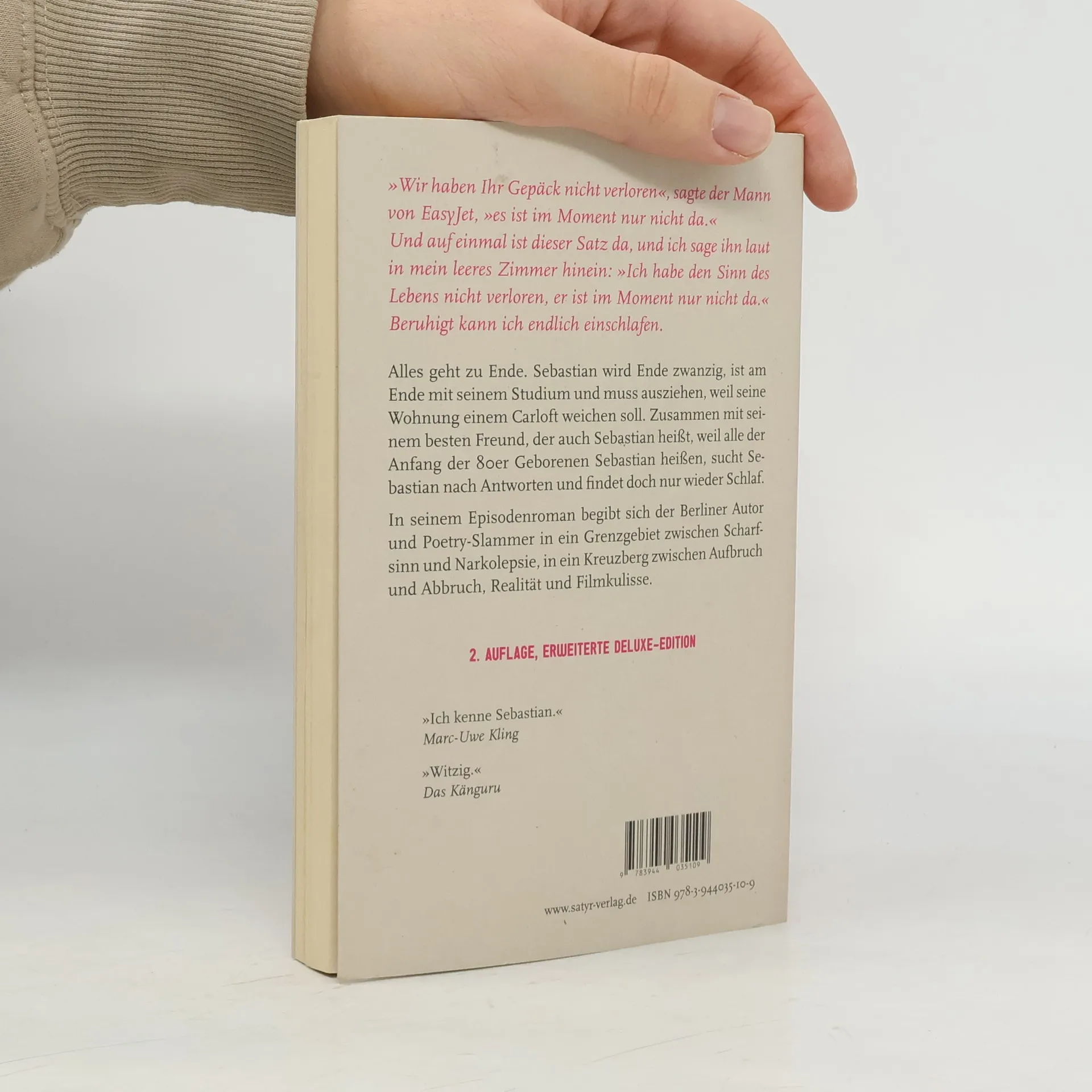 Alles geht zu Ende. Sebastian wird Ende zwanzig, ist am Ende mit seinem Studium und muss ausziehen, weil seine Wohnung einem Carloft weichen soll. Zusammen mit seinem besten Freund, der auch Sebastian heißt, weil alle der Anfang der 80er Geborenen Sebastian heißen, sucht Sebastian nach Antworten und findet doch nur wieder Schlaf. In seinem Episodenroman begibt sich der Berliner Autor und Poetry-Slammer Sebastian Lehmann in ein Grenzgebiet zwischen Scharfsinn und Narkolepsie, in ein Kreuzberg zwischen Aufbruch und Abbruch, Realität und Filmkulisse.