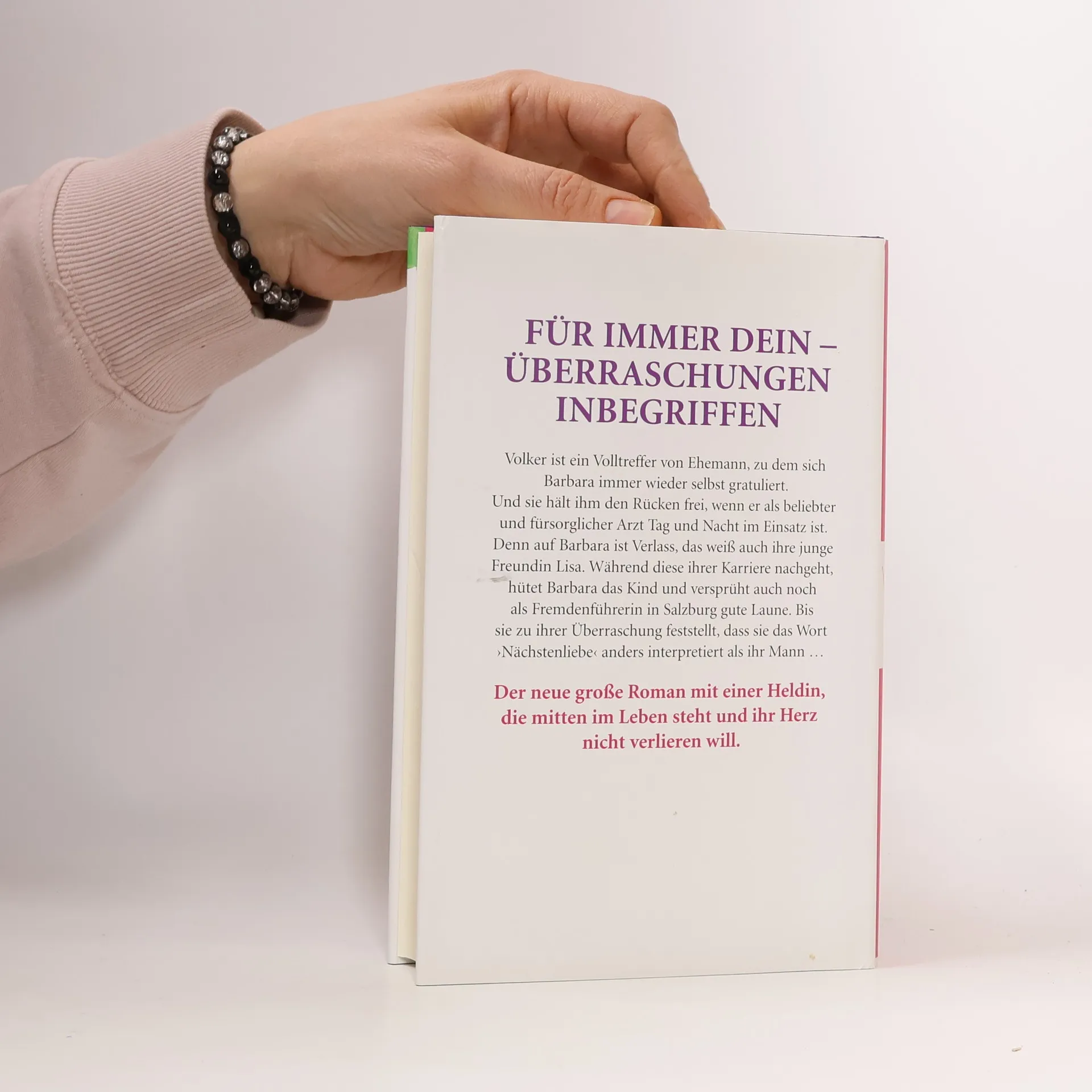 Für immer dein - Überraschungen inbegriffen Barbara ist Mutter zweier Töchter und glücklich verheiratet mit Volker, dem gut aussehenden, erfolgreichen Arzt. Volkers Söhne aus erster Ehe, seine Exfrau, die Schwiegermutter - alle sind gern gesehene Gäste im Hause Wieser. Denn neben ihrem Job als Fremdenführerin sorgt Barbara für Haushalt und harmonische Familienstimmung. Und als ihr mit der neuen Nachbarin Lisa auch noch eine beste Freundin ins Haus schneit, scheint Barbaras Glück perfekt. Für die Karriere der jungen Lisa kämpft sie wie eine Löwin, hütet deren Kind und vergisst sich mehr und mehr selbst. Bis sie erkennen muss, dass ihr Mann das Wort 'Nächstenliebe' anders interpretiert als sie, und ihre rosarote Welt zusammenstürzt. Tief verletzt flüchtet sie in ein Berghotel, wo ihr der Seminarleiter Justus behutsam wieder Selbstvertrauen gibt. Kann Liebe wirklich so blind machen?