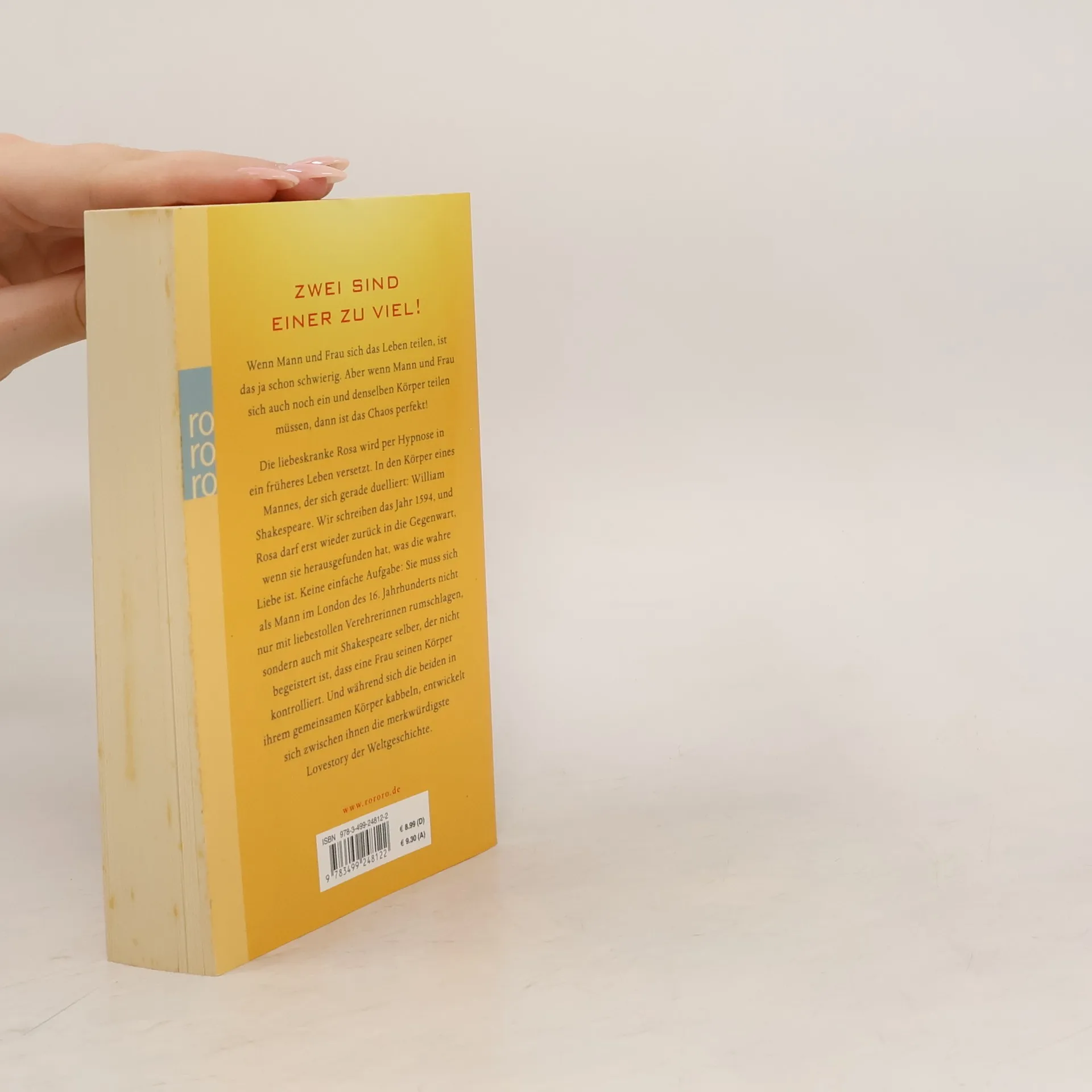 ZWEI SIND EINER ZU VIEL! Wenn Mann und Frau sich das Leben teilen, ist das ja schon schwierig. Aber wenn Mann und Frau sich auch noch ein und denselben Körper teilen müssen, dann ist das Chaos perfekt! Die liebeskranke Rosa wird per Hypnose in ein früheres Leben versetzt. In den Körper eines Mannes, der sich gerade duelliert: William Shakespeare. Wir schreiben das Jahr 1594, und Rosa darf erst wieder zurück in die Gegenwart, wenn sie herausgefunden hat, was die wahre Liebe ist. Keine einfache Aufgabe: Sie muss sich als Mann im London des 16. Jahrhunderts nicht nur mit liebestollen Verehrerinnen rumschlagen, sondern auch mit Shakespeare selber, der nicht begeistert ist, dass eine Frau seinen Körper kontrolliert. Und während sich die beiden in ihrem gemeinsamen Körper kabbeln, entwickelt sich zwischen ihnen die merkwürdigste Lovestory der Weltgeschichte.