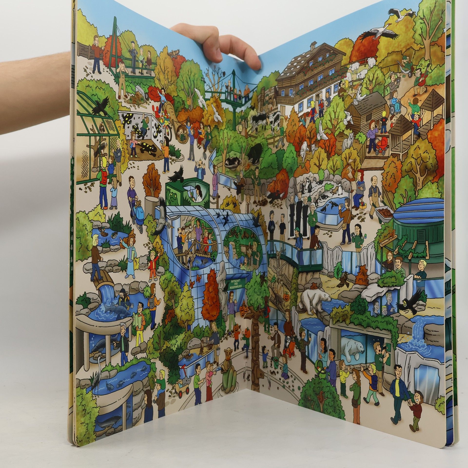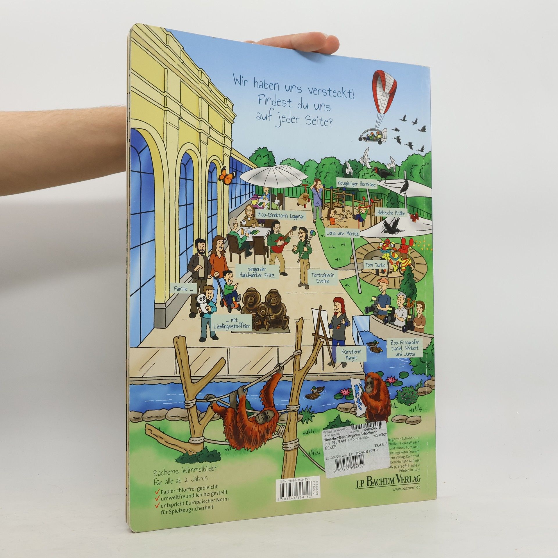 Mit dem Wimmelbilderbuch „Mein Tiergarten Schönbrunn – Ein Zoo für jede Jahreszeit“ können Zoo-Freunde von zu Hause aus eine Entdeckungsreise durch den ältesten Zoo der Welt unternehmen. Die Barock-Architektur des Zoos bildet zusammen mit dem bunten Treiben der Tiere und Besucher eine einzigartige Kulisse für einen spannenden Rundgang. Auf fünf großen Doppelseiten „wimmelt“ es von lustigen und detailgenauen Bildern. Jede Doppelseite zeigt den Zoo in einer anderen Jahreszeit: Im Sommer warten die Tiere auf eine Abkühlung, im Herbst sind die Laubbäume bunt und Halloween-Dekorationen „geistern“ durch den Tiergarten. Im Winter ist der Zoo festlich geschmückt, mit einem Weihnachtsbaum zwischen den Gehegen und einem Nikolaus, der Geschenke verteilt. Das Buch kommt ohne Text aus und erzählt seine Geschichte allein durch die Illustrationen, wodurch es für Menschen jeden Alters und aus verschiedenen Kulturen verständlich ist. Die bunten Szenen bieten beim Betrachten immer wieder neue Geschichten und Details, fördern das Lernen von logischen Zusammenhängen und begeistern nicht nur Kleinkinder, sondern Menschen aller Altersgruppen. Es entstand in Zusammenarbeit zwischen dem Tiergarten Schönbrunn und dem J. P. Bachem Verlag.