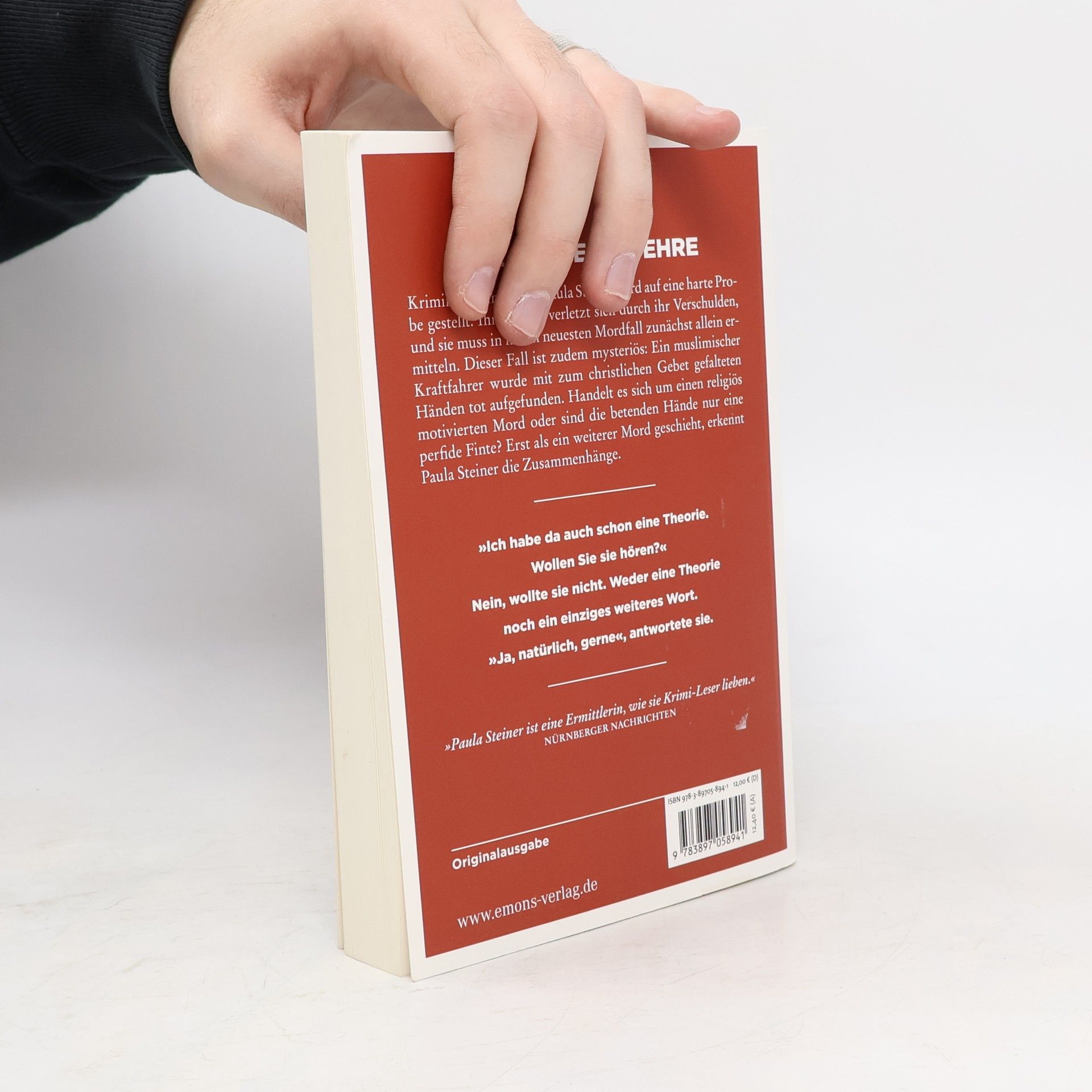 Kriminalkommissarin Paula Steiner wird auf eine harte Probe gestellt: Ihr Kollege verletzt sich durch ihr Verschulden, und sie muss in ihrem neuesten Mordfall zunächst allein ermitteln. Dieser Fall ist zudem mysteriös: Ein muslimischer Kraftfahrer wurde mit zum christlichen Gebet gefalteten Händen tot aufgefunden. Handelt es sich um einen religiös motivierten Mord, oder sind die betenden Hände nur eine perfide Finte? Erst als ein weiterer Mord geschieht, erkennt Paula Steiner die Zusammenhänge.