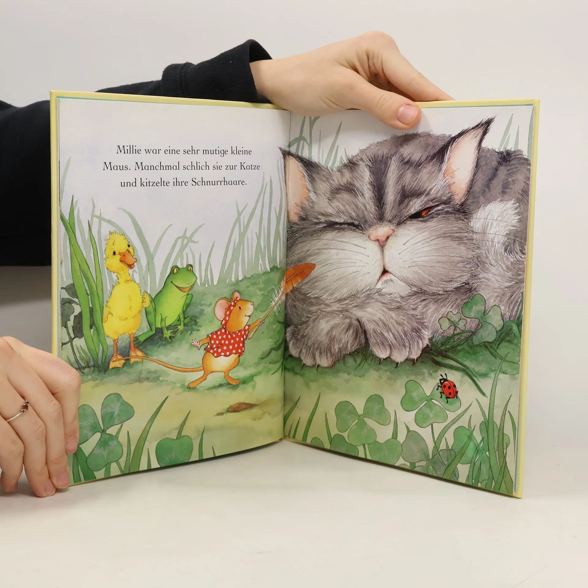 Millie ist eine mutige kleine Maus, die auf Maispflanzen klettert und die große Katze am Schnurrbart kitzelt. Sie ist froh und glücklich. Aber wenn einmal etwas schief geht, ist Millie gar nicht mehr mutig und auch nicht mehr froh. Dann muss ihre Mama sie ganz fest in den Arm nehmen, und schon geht es ihr wieder gut!