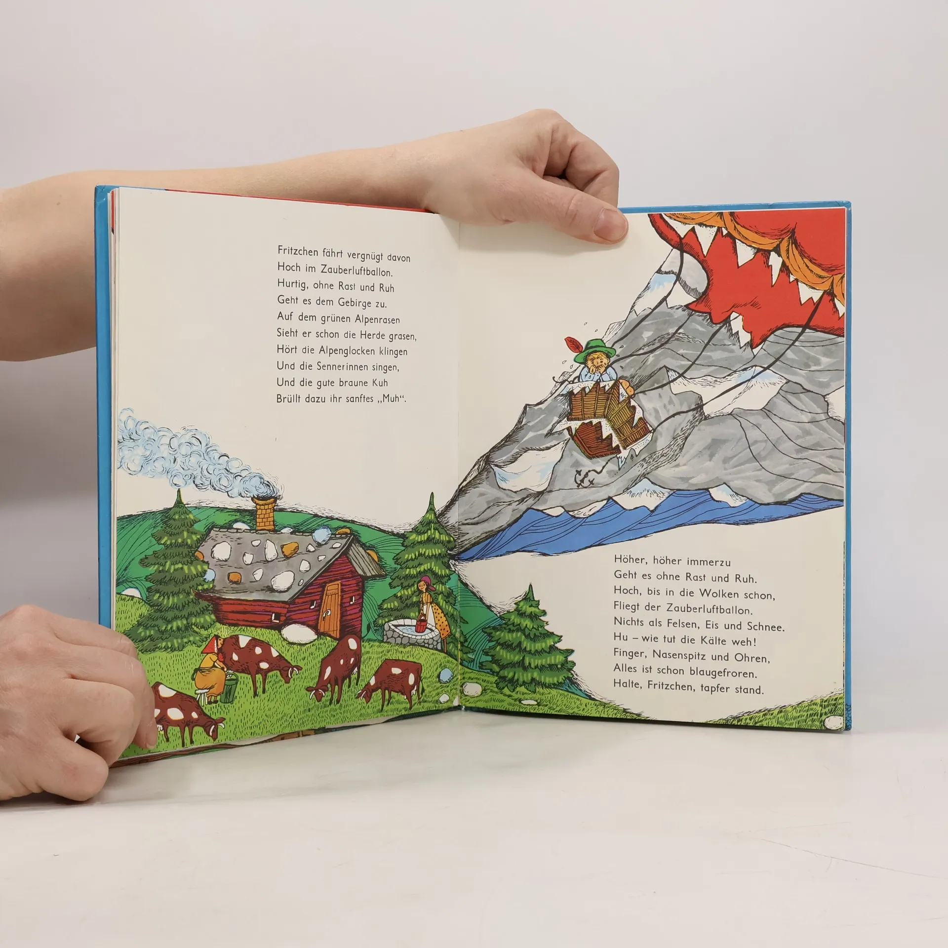 In der Nähe eines kleinen Dorfes am Waldesrand lebt der „Kleine Fritz“, der es liebt, durch Wald und Feld zu streifen, trotz der Warnungen seiner Mutter, in der Nähe zu bleiben. Eines Tages verdunkelt ein riesiger roter Ballon die Sonne, und Fritz entdeckt einen Pfeife rauchenden Mann darin – den Zauberer Hatschi Bratschi aus dem Morgenland, der Kinder fangen will. Bevor Fritz fliehen kann, wird er gefangen und in den Ballonkorb gezerrt. Trotz seiner verzweifelten Versuche, sich zu befreien, hält Hatschi Bratschi ihn fest. Während der Ballon über das Dorf schwebt, sucht der Zauberer mit einem Fernrohr nach weiteren Kindern, bis er sich zu weit nach vorne beugt und in einen tiefen Brunnen fällt. Fritz nutzt die Gelegenheit und fliegt mit dem Ballon davon. Auf seiner Reise wird er von köstlichem Bratenduft angelockt, ohne die Hexe Kniesebein zu bemerken, die versucht, den Ballon festzuhalten. Doch sie kann ihr Gewicht nicht halten und landet auf einem Schlot. Fritz setzt seine Reise fort, überwindet Berge und Täler und erreicht schließlich das blaue Meer sowie das Haus des Zauberers. Dort wird er zum neuen Herrscher und befreit alle entführten Kinder. Gemeinsam kehren sie im Luftballon nach Hause zurück, wo sie von ihren Eltern sehnsüchtig erwartet werden.