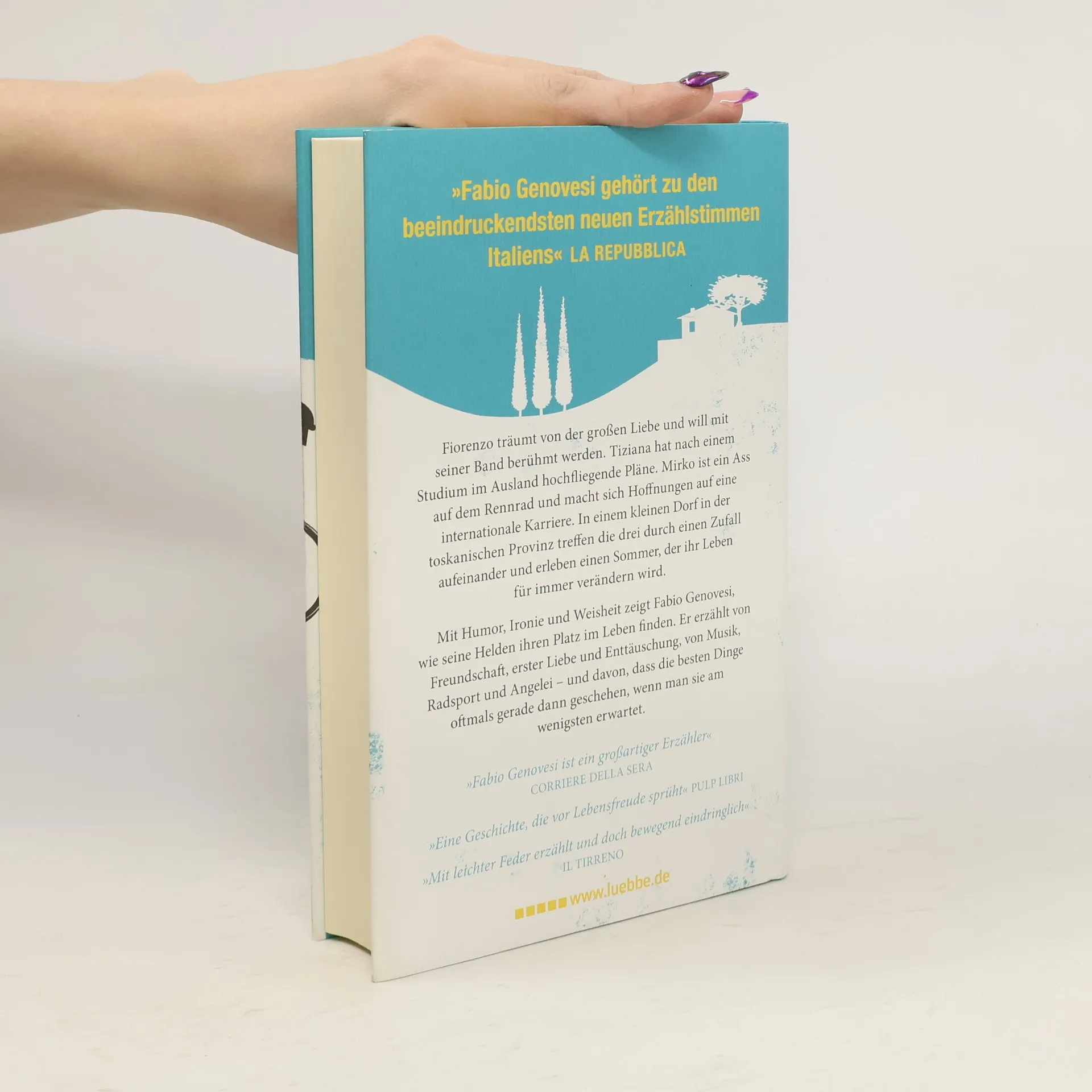 Fiorenzo träumt von der großen Liebe und will mit seiner Band berühmt werden. Tiziana hat nach einem Studium im Ausland hochfliegende Pläne. Mirko ist ein Ass auf dem Rennrad und macht sich Hoffnungen auf eine Profikarriere. In einem kleinen Dorf in der toskanischen Provinz treffen die drei durch einen Zufall aufeinander und erleben einen Sommer, der ihr Leben für immer verändern wird. Mit Humor, Ironie und Weisheit zeigt Fabio Genovesi, wie seine Helden ihren Platz im Leben finden. Er erzählt von Freundschaft, erster Liebe und Enttäuschung, von Musik, Radsport und Angelei - und davon, dass die besten Dinge oftmals gerade dann geschehen, wenn man sie am wenigsten erwartet.
