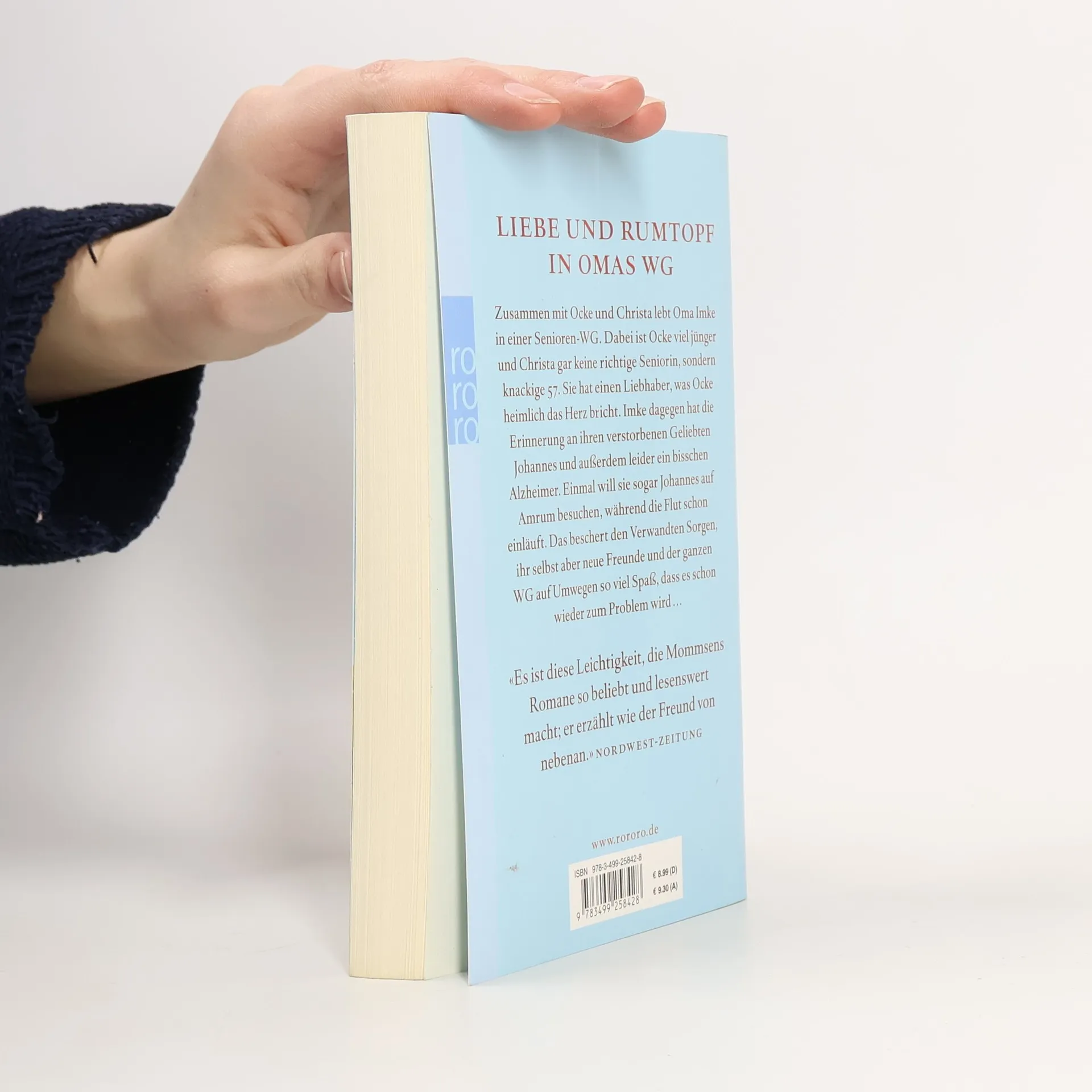 LIEBE UND RUMTOPF IN OMAS WG. Zusammen mit Ocke und Christa lebt Oma Imke in einer Senioren-WG. Dabei ist Ocke viel jünger und Christa gar keine richtige Seniorin, sondern knackige 57. Sie hat einen Liebhaber, was Ocke heimlich das Herz bricht. Imke dagegen hat die Erinnerung an ihren verstorbenen Geliebten Johannes und außerdem leider ein bisschen Alzheimer. Einmal will sie sogar Johannes auf Amrum besuchen, während die Flut schon aufläuft. Das beschert den Verwandten Sorgen, ihr selbst aber neue Freunde und der ganzen WG auf Umwegen so viel Spaß, dass es schon wieder zum Problem wird. «Es ist diese Leichtigkeit, die Mommsens Romane so beliebt und lesenswert macht; er erzählt wie der Freund von nebenan.» (Nordwest-Zeitung)