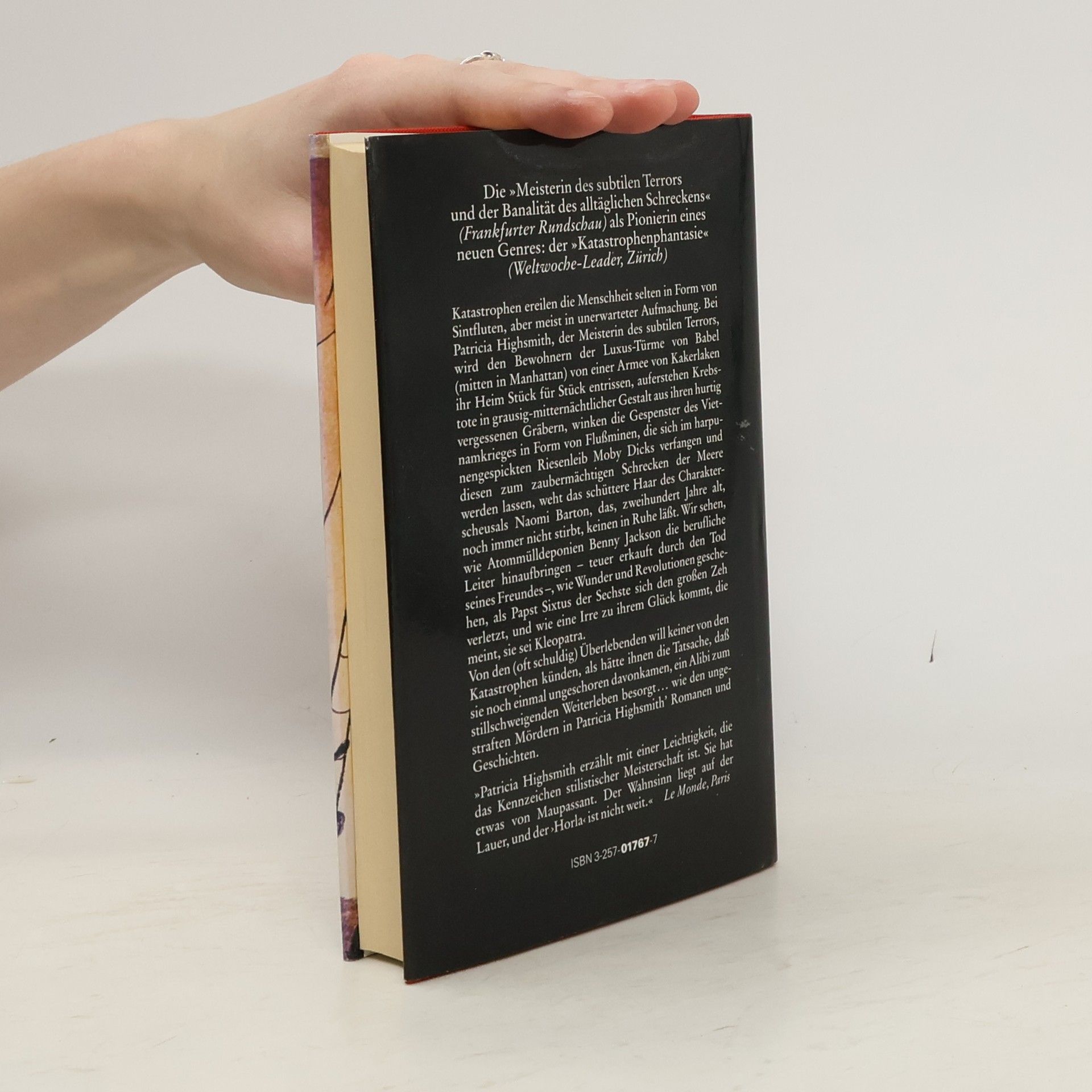 Groteske Geschwüre, die auf einem Friedhof in Österreich ins Unermessliche wachsen; riesige Kakerlaken, gegen alle Insektenmittel resistent, die in einem New Yorker Apartment-Haus das Kommando übernehmen; eine UNO-Mission, die in Afrika grausam endet; Wale, der Papst, ein waffenverliebter US-Präsident sie alle bilden den Stoff, aus dem moderne (natürliche oder unnatürliche) Katastrophen sind. Bei Patricia Highsmith entsteht das Grauen dadurch, dass die Menschen sich so verhalten, wie sie sich eben verhalten, ohne dass übersinnliche böse Mächte ins Spiel kommen.