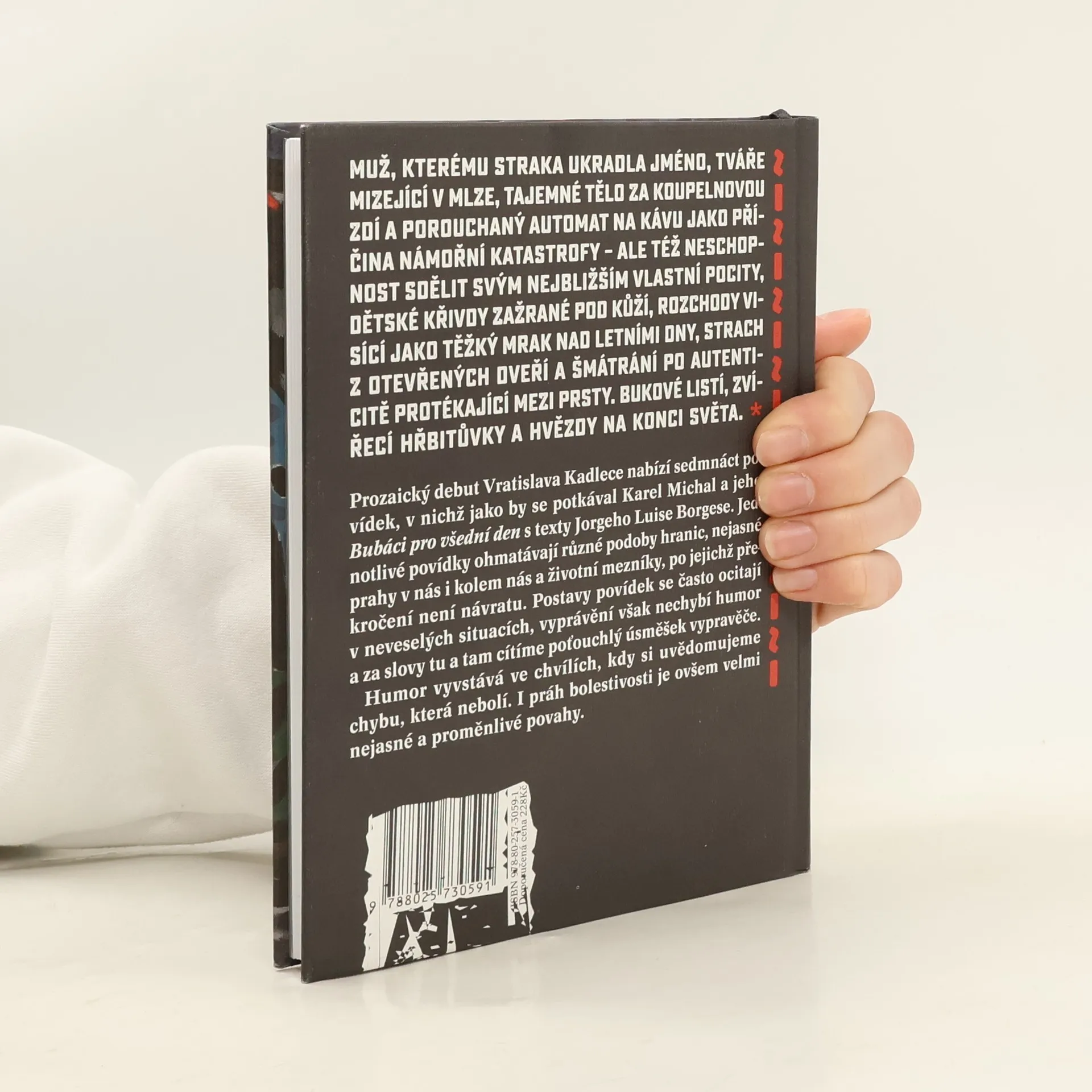 Muž, kterému straka ukradla jméno, tváře mizející v mlze, tajemné tělo za koupelnovou zdí a porouchaný automat na kávu jako příčina námořní katastrofy – ale též neschopnost sdělit svým nejbližším vlastní pocity, dětské křivdy zažrané pod kůží, rozchody visící jako těžký mrak nad letními dny, strach z otevřených dveří a šmátrání po autenticitě protékající mezi prsty. Bukové listí, zvířecí hřbitůvky a hvězdy na konci světa. Prozaický debut Vratislava Kadlece nabízí sedmnáct povídek různé délky a rozmanité formy, v nichž jako by se potkával Karel Michal a jeho Bubáci pro všední den s texty Jorge Luise Borgese. Jednotlivé povídky ohmatávají různé podoby hranic, nejasné prahy v nás i kolem nás a životní mezníky, po jejichž překročení není návratu. Postavy povídek se často ocitají v neveselých situacích, vyprávění však nechybí místy potemnělý, jindy zas jasnější humor. Humor vyvstává ve chvílích, kdy si uvědomujeme chybu, která – řečeno s Aristotelem – nebolí. I práh bolestivosti je ovšem velmi nejasné a proměnlivé povahy.