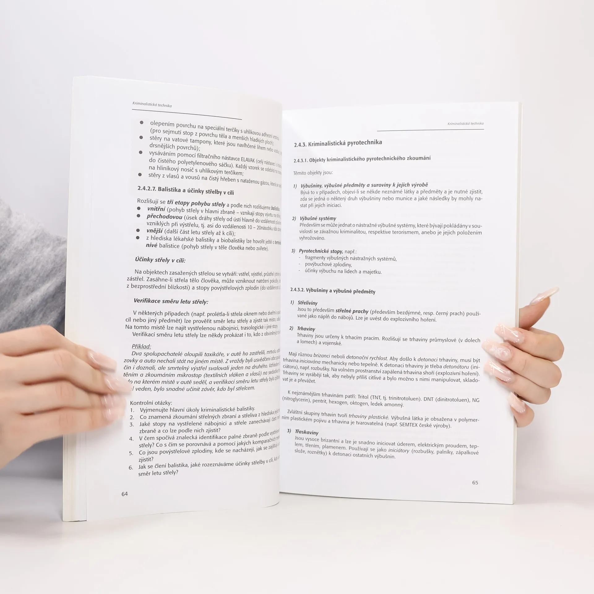 Autoři skripta se velice přehlednou formou zabývájí nejdůležitějšími oblastmi kriminalistiky, rozebírají jednotlivé kriminalistické techniky jako je např. daktyloskopie, fonoskopie, trasologie atp. Další část publikace se zabývá kriminalistickou taktikou, kam spadá např. ohledání, výslech, rekognice apod. Poslední kapitola pojednává o metodice vyšetřování jednotlivých druhů trestných činů (např. krádeže, loupeže, drogová kriminalita).