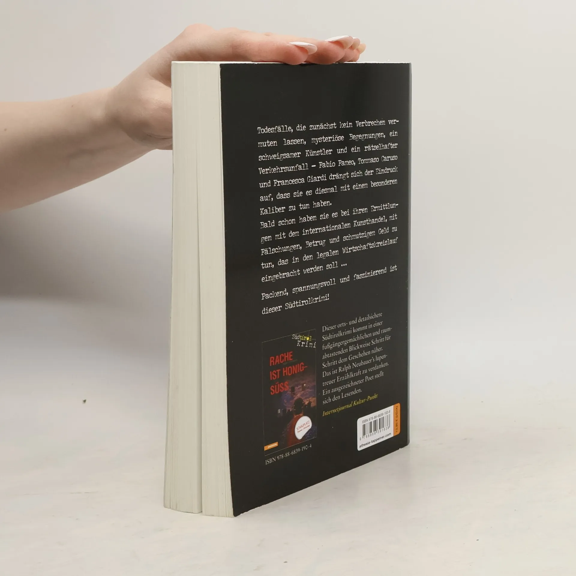 Der internationale Kunsthandel, Fälschungen, Betrug, der schöne Schein und Geldwäsche sind die Delikte mit denen sich Commissario Fabio Fameo, Tommaso Caruso und Francesca Giardi in diesem Südtirolkrimi befassen müssen. Todesfälle, die zunächst kein Verbrechen ahnen lassen, ein Künstler als Opfer und ein mysteriöser Verkehrsunfall lassen die Ermittler erahnen, dass sie es diesmal mit Verbrechern eines besonderen Kalibers zu tun haben.