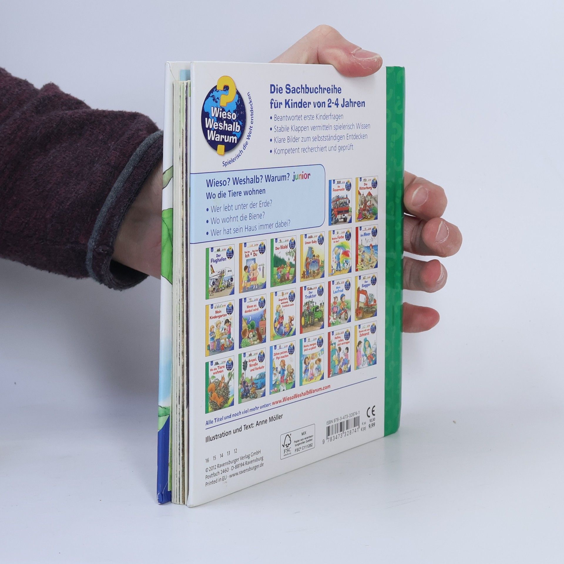 Menschen wohnen in Häusern, das weiß jedes Kind. Auch Hund und Katze fühlen sich hier sehr wohl. Aber wo wohnen die vielen anderen Tiere? Dieses Buch zeigt die Nester von Storch, Schwalbe und Gimpel, den unterirdischen Bau von Kaninchen und Maulwurf, die Burg des Bibers, den Bienenstock und sogar Fledermäuse gibt es zu entdecken! Die Weinbergschnecke hingegen hat ihr Haus immer dabei. Sie versteckt sich auf jeder Doppelseite im Buch und möchte gern gefunden werden. Wieso? Weshalb? Warum? junior Die Sachbuchreihe für Kinder von 2-4 Jahren Jeden Tag entdecken Kinder etwas Neues – und haben viele Fragen. Wann kommt die Feuerwehr? Was machen die Tiere im Winter? Warum muss ich Zähne putzen? Die beliebte Sachbuchreihe Wieso? Weshalb? Warum? junior beantwortet die Fragen der Kinder auf Augenhöhe. Sie beleuchtet unterschiedlichste Themen aus ihrer Alltags- und Interessenswelt altersgerecht und mit viel Liebe zum Detail. Die Reihe ist speziell auf kleine Hände und die Bedürfnisse der Kleinsten angepasst. Klare und liebevolle Bilder, kurze Sachtexte sowie handliche Klappen, die Bewegungen veranschaulichen und überraschende und lustige Einblicke gewähren, ermöglichen Kindern, sich ihre Themen selbst zu erschließen. Der Spaß am eigenhändigen Entdecken, die liebevolle Umsetzung und die hochwertige Ausstattung garantieren langanhaltende Freude an jedem Buch.