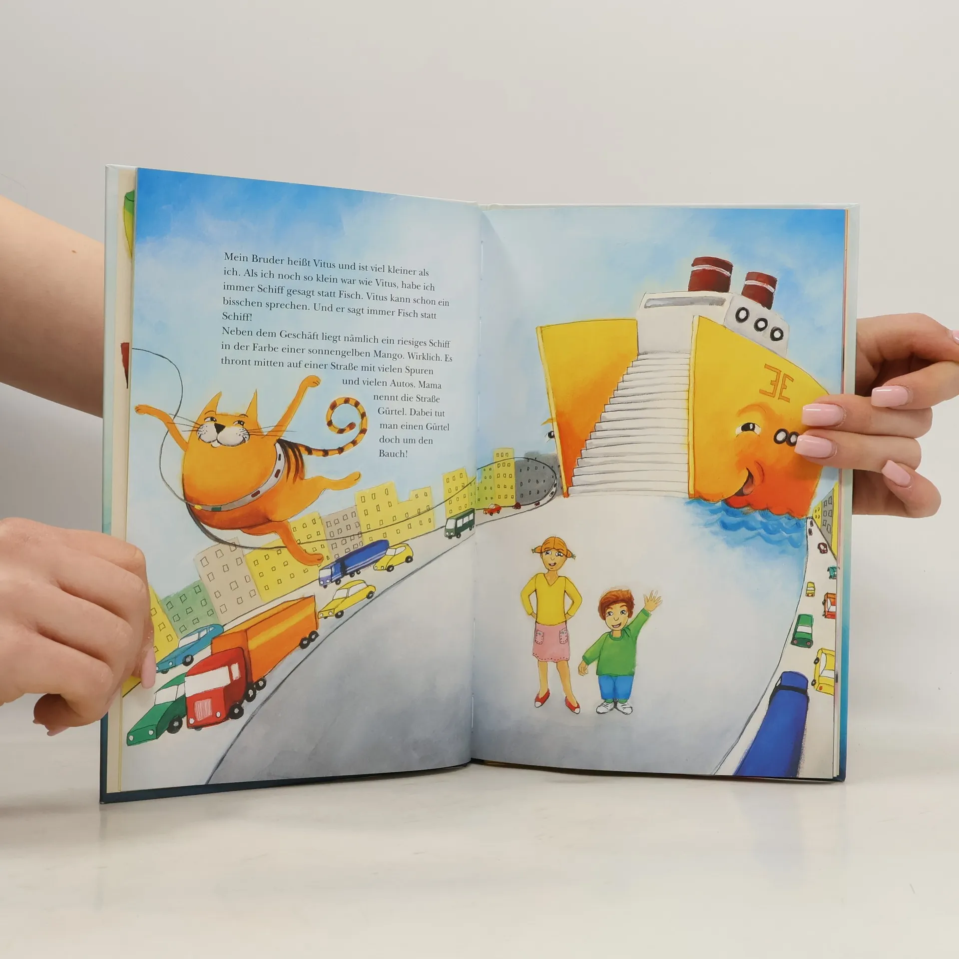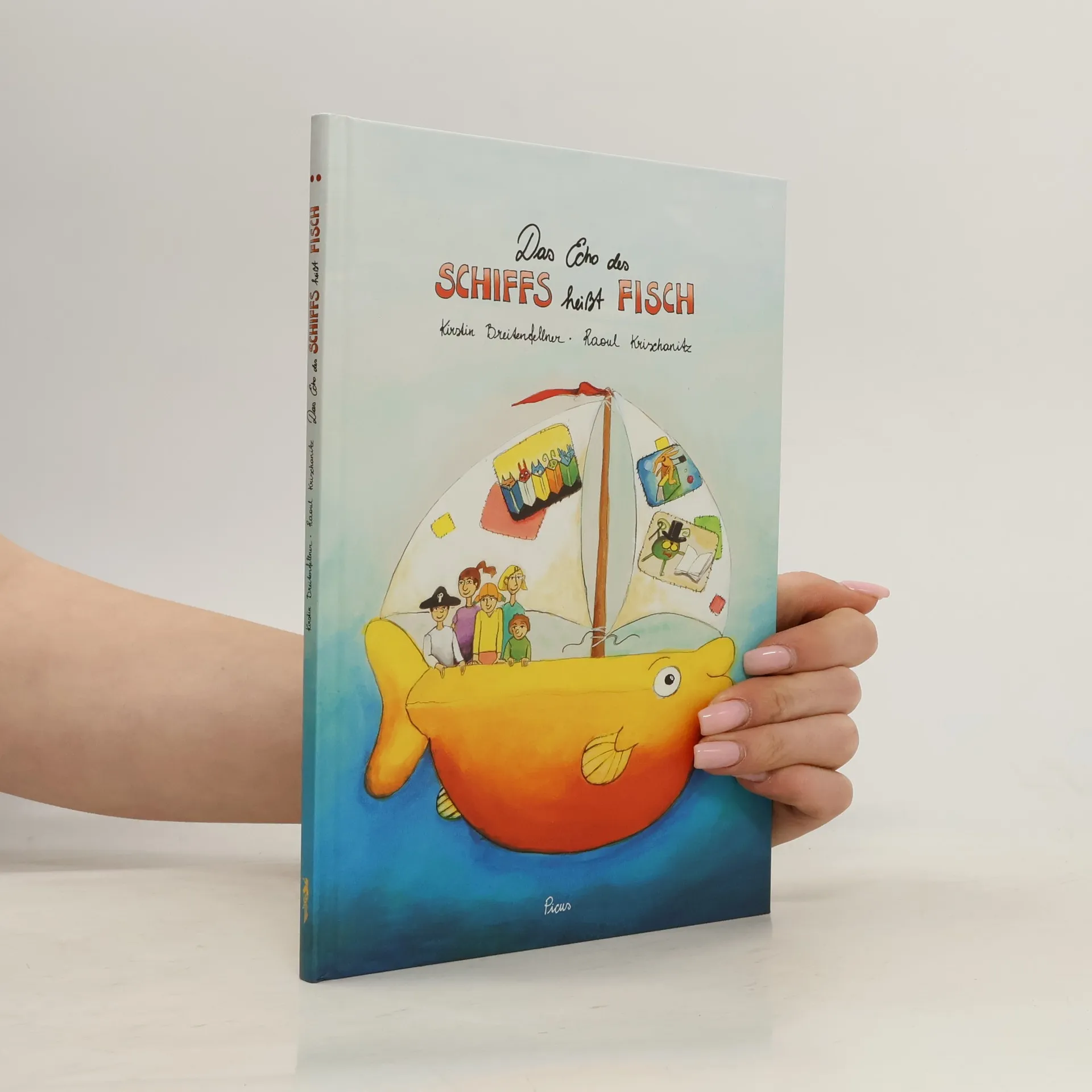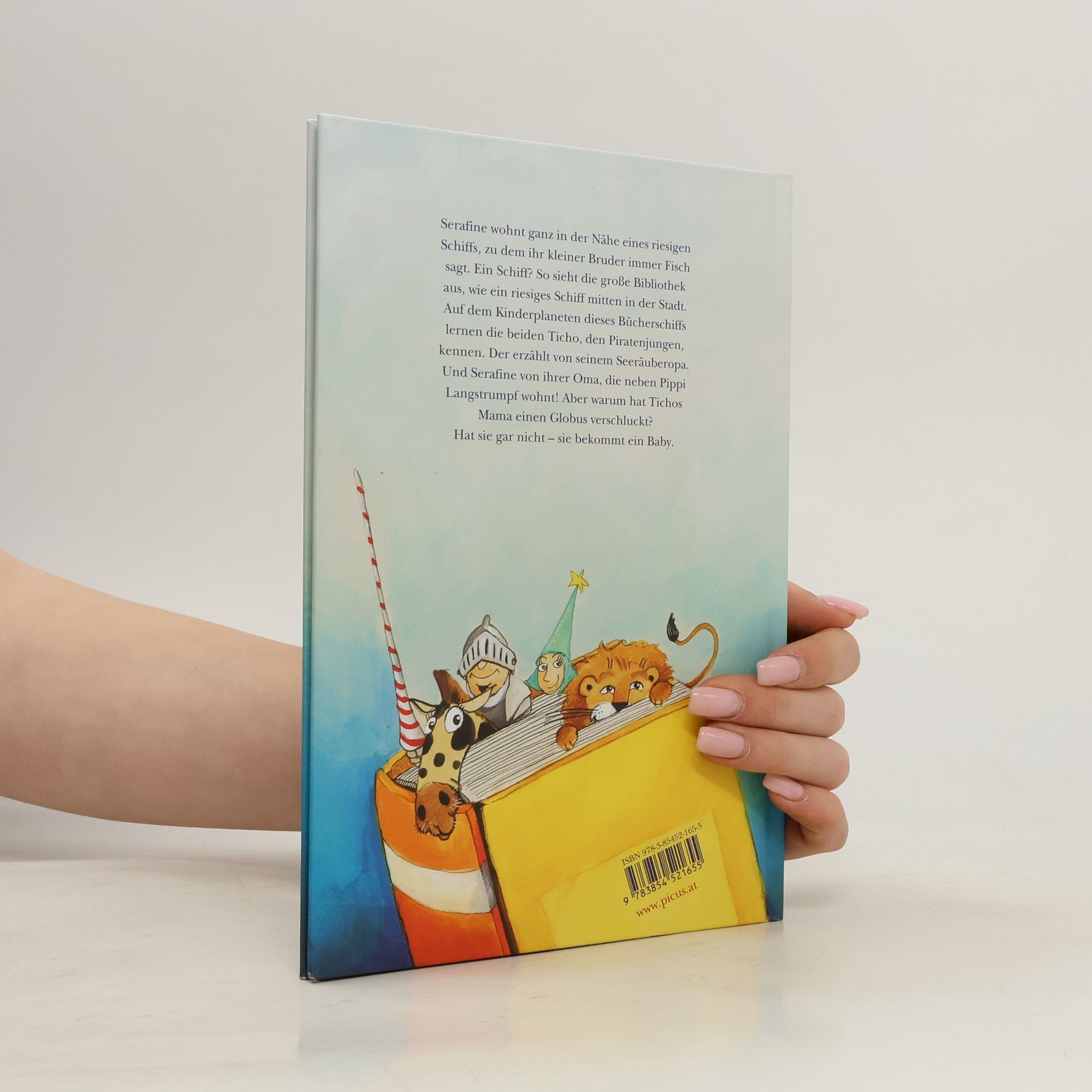 Serafine wohnt in Wien, ganz in der Nähe von einem riesigen Schiff, zu dem ihr kleiner Bruder Vitus immer Fisch sagt. Schiff? Die Bibliothek, in der man Bücher ausleihen kann, sieht wie ein riesiges Schiff aus. Serafine, Vitus und Mama besuchen die Bibliothek, in der es tausend Millionen Bücher gibt, eine Spielecke und – Piraten. Ticho, der kleine Junge, den sie kennenlernen, ist so ein Pirat und erzählt von seinem Seeräuberopa. Serafines Oma hingegen wohnt neben Pippi Langstrumpf! Und Tichos Mama hat wohl einen Globus verschluckt – in Wirklichkeit bekommt sie ein Baby, das Anna heißen soll. Kirstin Breitenfellner erzählt klug und kindgerecht von Bibliotheken und Geschichten und erklärt spielerisch wie nebenbei, was ein Palindrom ist oder was der Begriff Heimat bedeutet. Raoul Krischanitz erweckt die Geschichte durch seine farbenfrohen und fantasiereichen Illustrationen zum Leben und zeigt, was es in einer Bibliothek alles zu entdecken gibt.