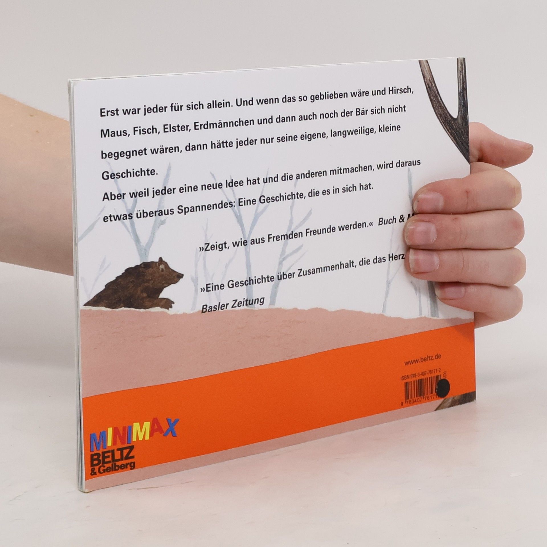 Vielleicht hätte die Zeit noch gereicht, um den Eimer fallen zu lassen und davonzurennen. Dann wäre die Geschichte anders verlaufen. Erst war jeder für sich allein. Und wenn das so geblieben wäre und Hirsch, Maus, Fisch, Elster, Erdmännchen und dann auch noch der Bär sich nicht begegnet wären, dann hätte jeder nur seine eigene, langweilige, kleine Geschichte. Aber weil jeder eine neue Idee hat und die anderen mitmachen, wird daraus eine Geschichte, die es in sich hat.