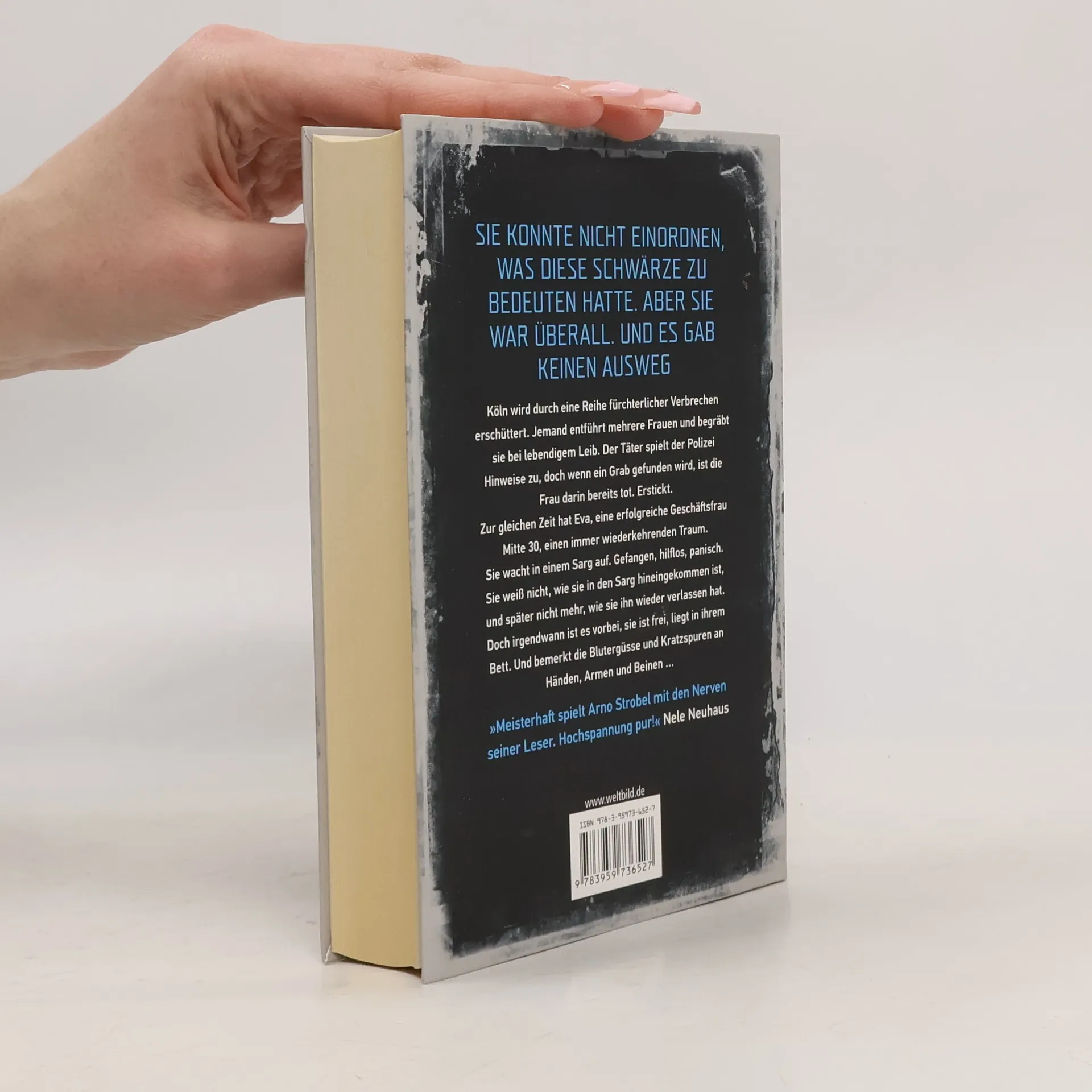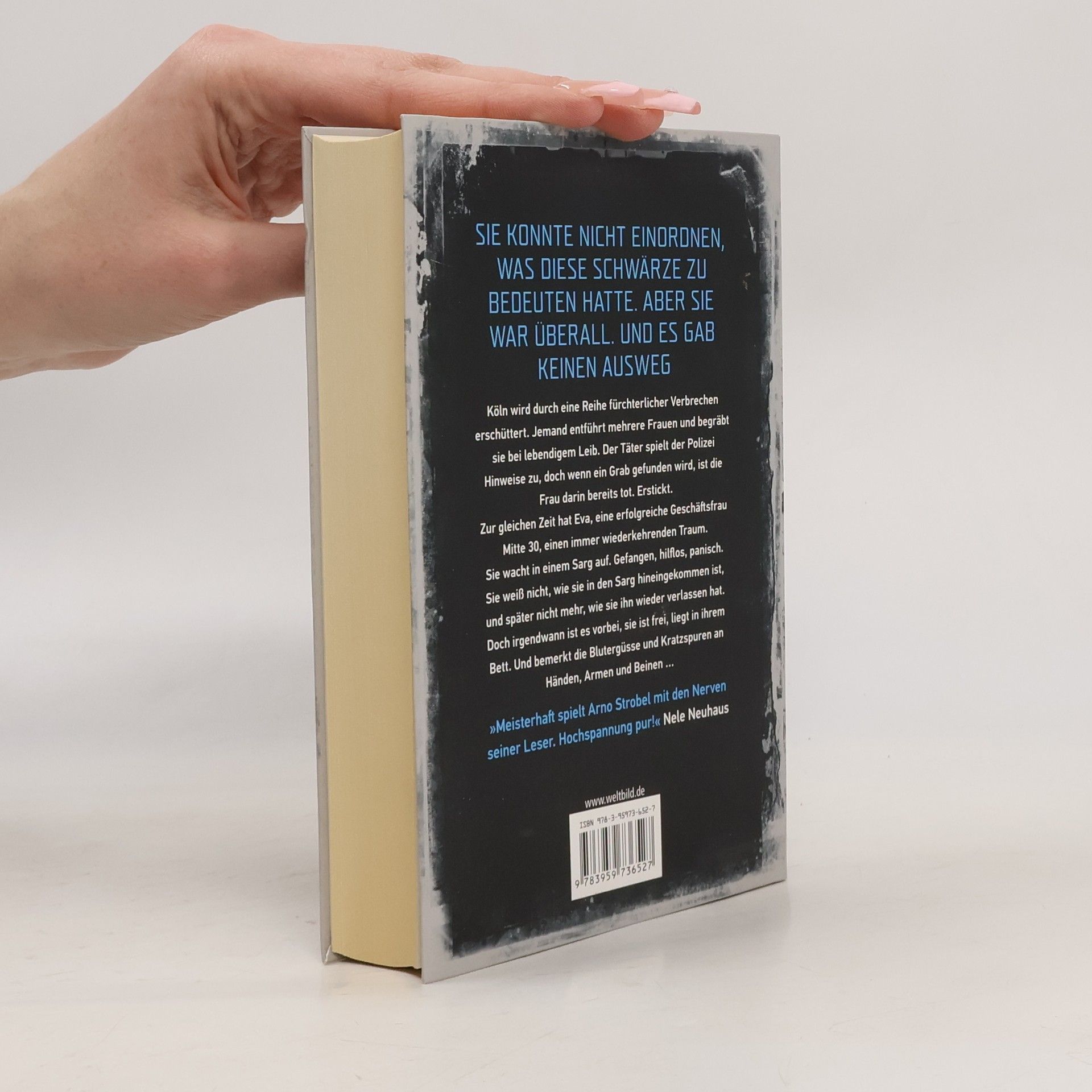 "Sie konnte nicht einordnen, was diese Schwärze zu bedeuten hatte. Aber sie war überall. Und es gab keinen Ausweg." Köln wird durch eine Reihe fürchterlicher Verbrechen erschüttert. Jemand entführt mehrere Frauen und begräbt sie bei lebendigem Leib. Der Täter spielt der Polizei Hinweise zu, doch wenn ein Grab gefunden wird, ist die Frau darin bereits tot. Erstickt. Zur gleichen Zeit hat Eva, eine erfolgreiche Geschäftsfrau Mitte 30, einen immer wiederkehrenden Traum. Sie wacht in einem Sarg auf. Gefangen, hilflos, panisch. Sie weiß nicht, wie sie in den Sarg hineingekommen ist, und später nicht mehr, wie sie ihn wieder verlassen hat. Doch irgendwann ist es vorbei, sie ist frei, liegt in ihrem Bett. Und bemerkt die Blutergüsse und Kratzspuren an Händen, Armen und Beinen...