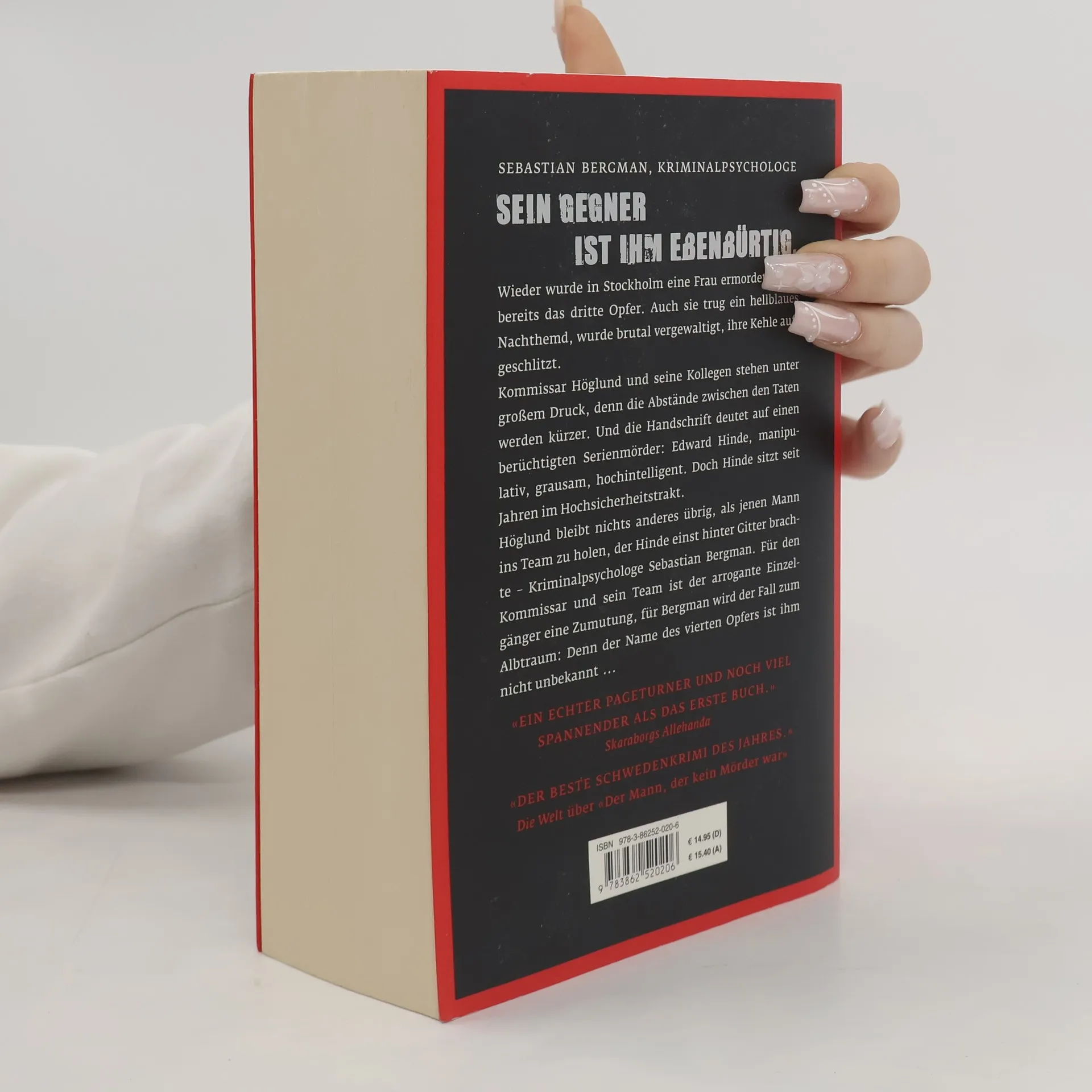 Sebastian Bergman, Kriminalpsychologe: SEIN GEGNER IST IHM EBENBÜRTIG. Wieder wurde in Stockholm eine Frau ermordet, es ist bereits das dritte Opfer. Auch sie trug ein hellblaues Nachthemd, wurde brutal vergewaltigt, ihre Kehle aufgeschlitzt. Kommissar Höglund und seine Kollegen stehen unter großem Druck, denn die Abstände zwischen den Taten werden kürzer. Und die Handschrift deutet auf einen berüchtigten Serienmörder: Edward Hinde, manipulativ, grausam, hochintelligent. Doch Hinde sitzt seit Jahren im Hochsicherheitstrakt. Höglund bleibt nichts anderes übrig, als jenen Mann ins Team zu holen, der Hinde einst hinter Gitter brachte – Kriminalpsychologe Sebastian Bergman. Für den Kommissar und sein Team ist der arrogante Einzelgänger eine Zumutung, für Bergman wird der Fall zum Albtraum: Denn der Name des vierten Opfers ist ihm nicht unbekannt  ... Sebastian Bergmans zweiter Fall
