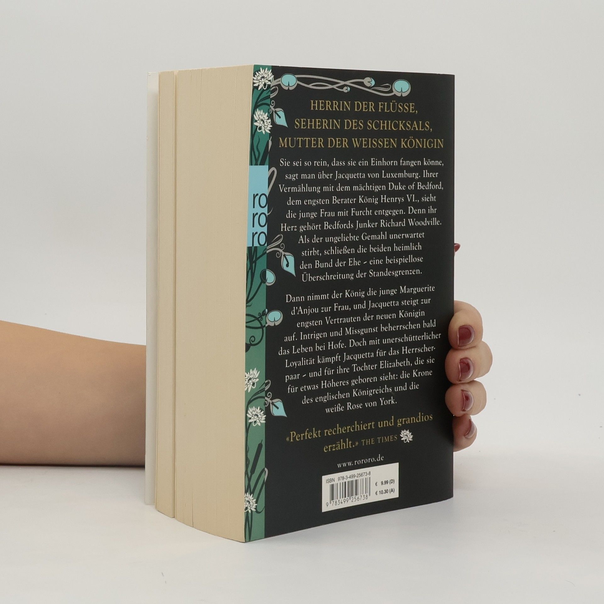 Herrin der Flüsse, Seherin des Schicksals, Mutter der weißen Königin. Sie sei so rein, dass sie ein Einhorn fangen könne, sagt man über Jacquetta von Luxemburg. Ihrer Vermählung mit dem mächtigen Duke of Bedford, dem engsten Berater König Henrys VI., sieht die junge Frau mit Furcht entgegen. Denn ihr Herz gehört Bedfords Junker Richard Woodville. Als der ungeliebte Gemahl unerwartet stirbt, schließen die beiden heimlich den Bund der Ehe – eine beispiellose Überschreitung der Standesgrenzen.Dann nimmt der König die junge Marguerite d’Anjou zur Frau, und Jacquetta steigt zur engsten Vertrauten der neuen Königin auf. Intrigen und Missgunst beherrschen bald das Leben bei Hofe. Doch mit unerschütterlicher Loyalität kämpft Jacquetta für das Herrscherpaar – und für ihre Tochter Elizabeth, die sie für etwas Höheres geboren sieht: die Krone des englischen Königreichs und die weiße Rose von York.