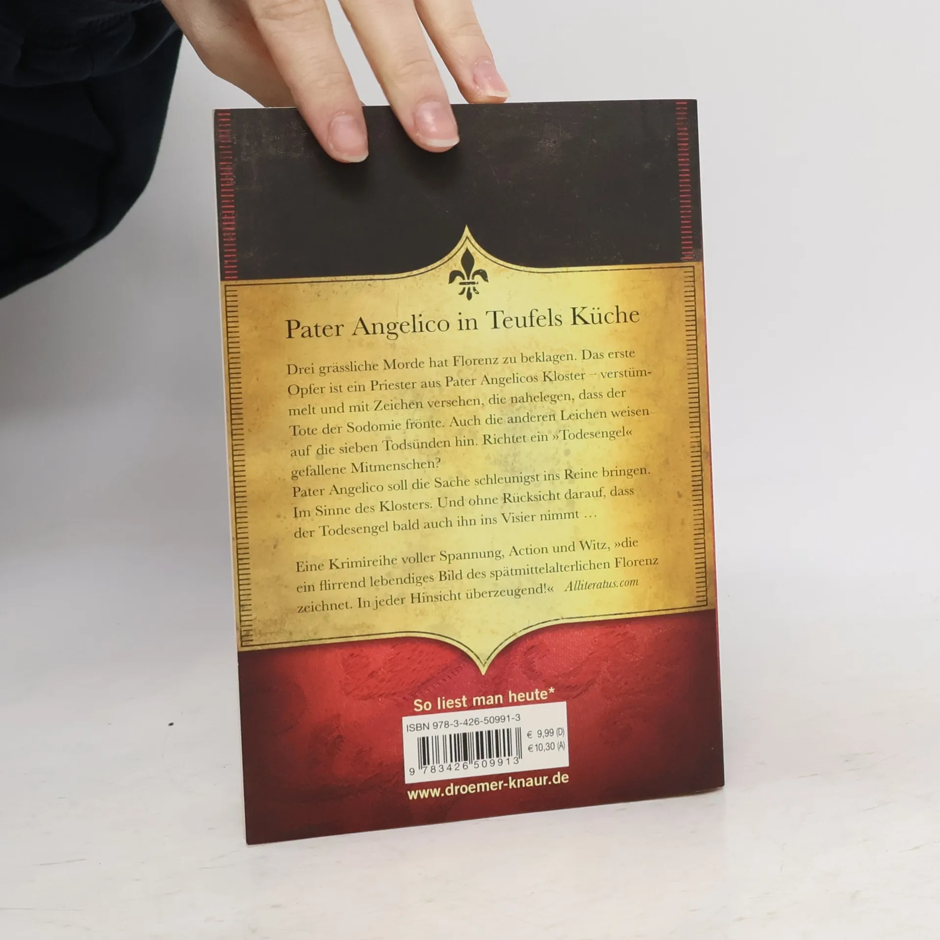 Drei grässliche Morde hat Florenz in kürzester Zeit zu beklagen. Das erste Opfer ist ein Priester aus Pater Angelicos Kloster – verstümmelt und mit Zeichen versehen, die nahelegen, dass der Tote der Sodomie frönte. Prior Vincenzo Bandelli, wie immer über Kreuz mit Pater Angelico, besteht darauf, dass dieser die Sache schleunigst ins Reine bringt. Auch die anderen Leichen weisen blutige Markierungen auf, die auf die sieben Todsünden hindeuten. Richtet ein strafender Todesengel sündige Mitmenschen hin? Ein Todesengel, der es bald auch auf den Pater abgesehen hat, als dieser Fortschritte bei seinen Ermittlungen macht. Pater Angelico in Teufels Küche …