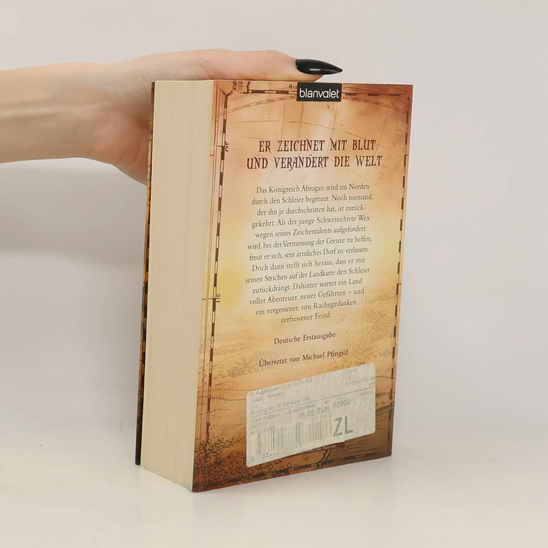 Ein junger Kartograph. Er zeichnet mit Blut und verändert die Welt. Das Königreich Abrogan wird im Norden durch den Schleier begrenzt. Noch niemand, der ihn durchschritten hat, ist je zurückgekehrt. Als der junge Schweinehirte Wex wegen seines Zeichentalents aufgefordert wird, bei der Vermessung der Grenze zu helfen, freut er sich, sein ärmliches Dorf zu verlassen. Doch dann stellt sich heraus, dass er mit seinen Strichen auf der Landkarte den Schleier zurückdrängt. Dahinter wartet ein Land voller Abenteuer, neuer Gefährten – und ein alter, von Rachegedanken zerfressener Feind.