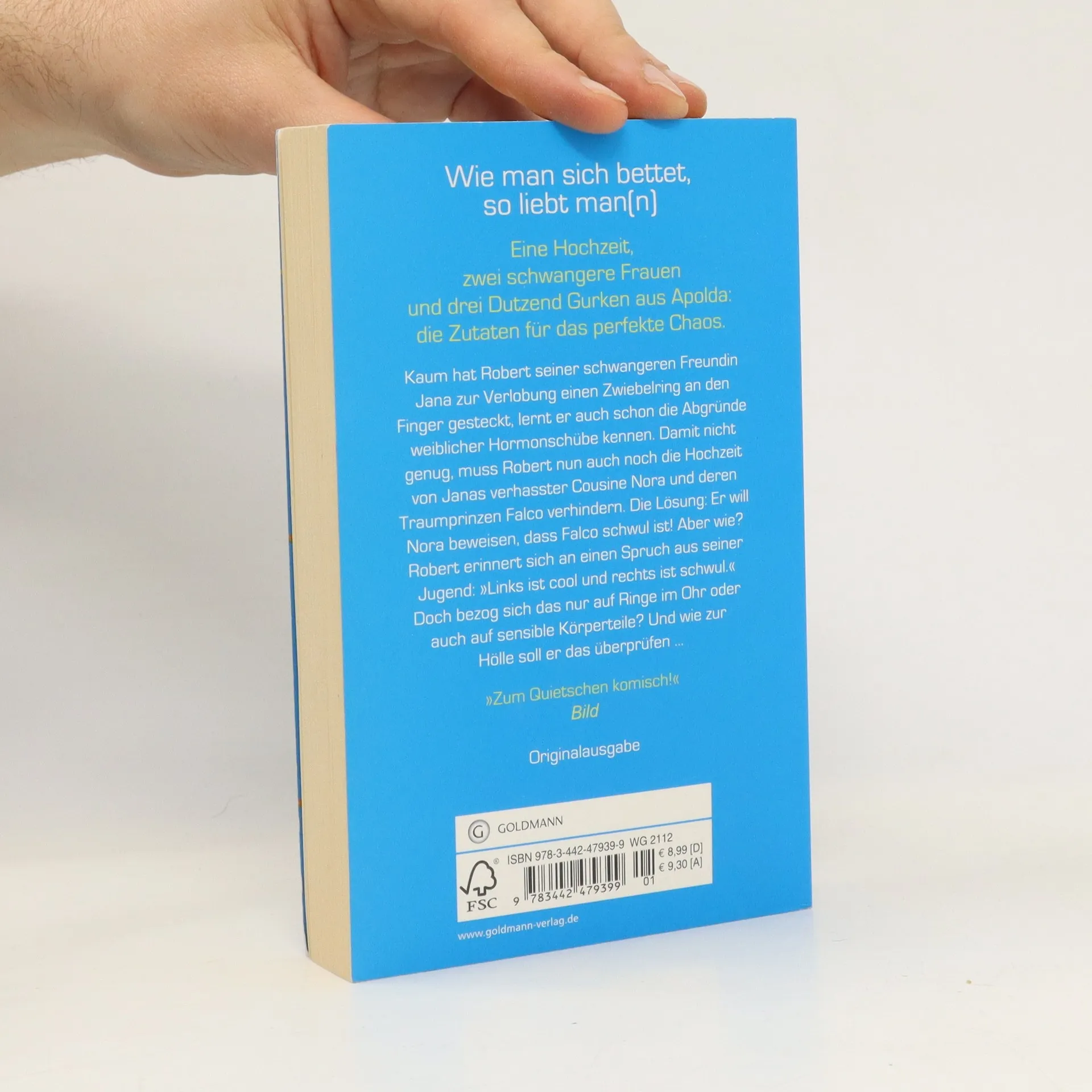Eine Hochzeit, zwei schwangere Frauen und drei Dutzend Gurken aus Apolda: die Zutaten für das perfekte Chaos. Kaum hat Robert seiner schwangeren Freundin Jana zur Verlobung einen Zwiebelring an den Finger gesteckt, lernt er auch schon die Abgründe weiblicher Hormonschübe kennen. Damit nicht genug, muss Robert nun auch noch die Hochzeit von Janas verhasster Cousine Nora und deren Traumprinzen Falco verhindern. Die Lösung: Er will Nora beweisen, dass Falco schwul ist! Aber wie? Robert erinnert sich an einen Spruch aus seiner Jugend: „Links ist cool und rechts ist schwul.“ Doch bezog sich das nur auf Ringe im Ohr oder auch auf sensible Körperteile? Und wie zur Hölle soll er das überprüfen ...?!