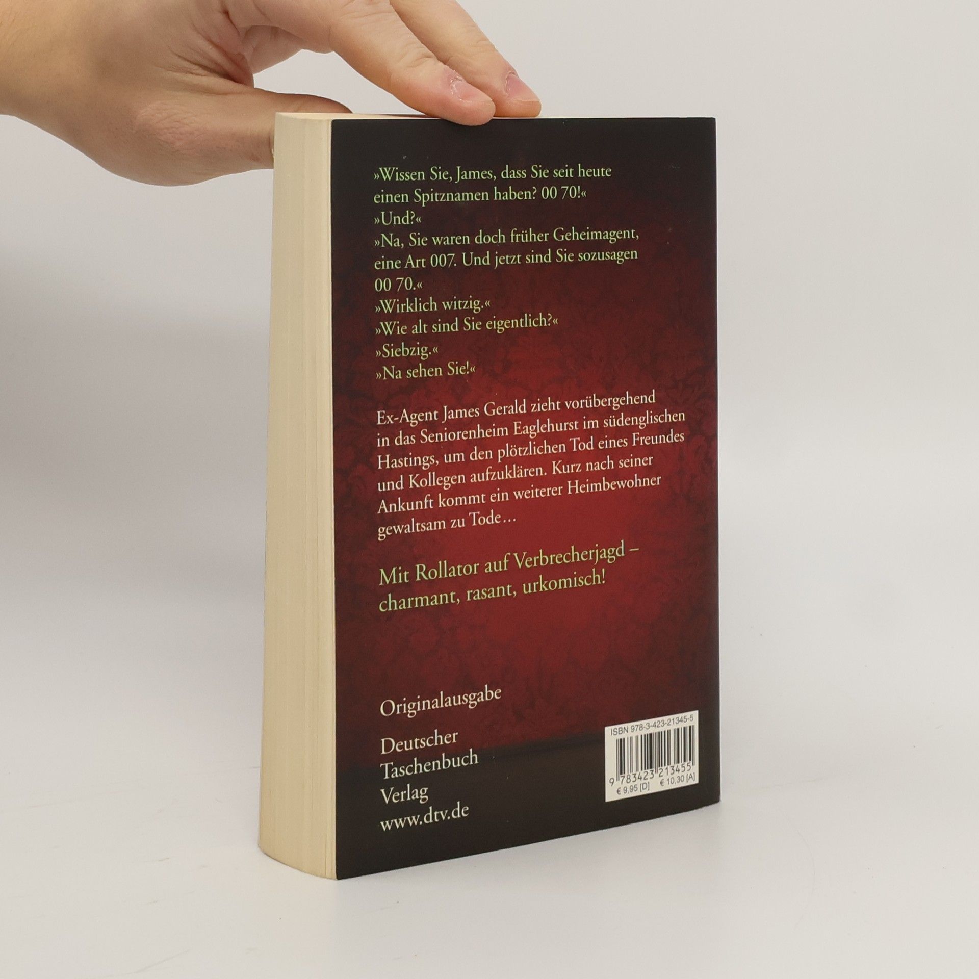 Mit Rollator und Reizgasdüse auf Verbrecherjagd »Es war nicht seine Entscheidung gewesen, hierherzukommen. Nach Eaglehurst im Allgemeinen und in das Zimmer Nummer 214 im Besonderen. Das hatte William für ihn entschieden, und jetzt lag es an ihm, die bevorstehende Aufgabe zu lösen.« Ex-Agent James Gerald (70) zieht vorübergehend in das Seniorenheim Eaglehurst in Hastings, um den Tod seines Freundes und Kollegen William Morat aufzuklären. Kurz nach James' Ankunft kommen zwei weitere Heimbewohner zu Tode. Bald kommt er mit Hilfe seiner früheren Kollegin Sheila Humphrey einem dunklen Geheimnis auf die Spur ...